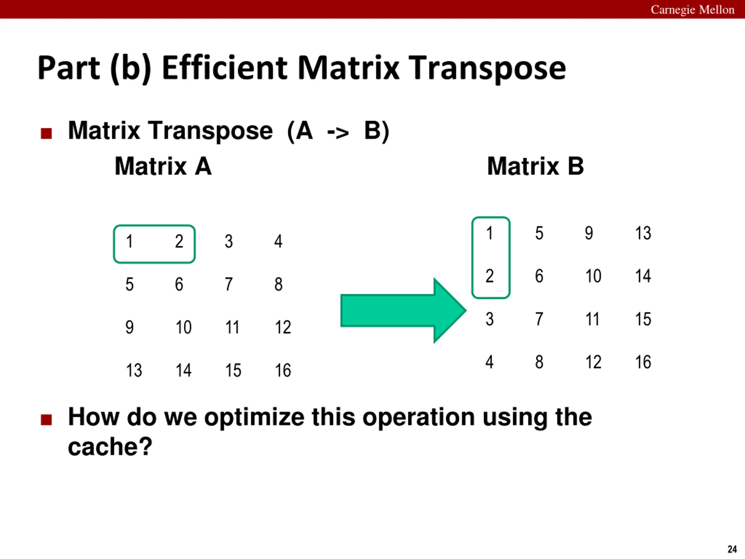 Carnegie Mellon Part (b) Efficient Matrix Transpose Matrix Transpose (A -> B) Matrix A Matrix B 1 5 9 13 1 2 3 4 2 6 10 14 5 6 7 8 3 7 11 15 9 10 11 12 4 8 12 16 13 14 15 16 How do we optimize this operation using the cache? 24