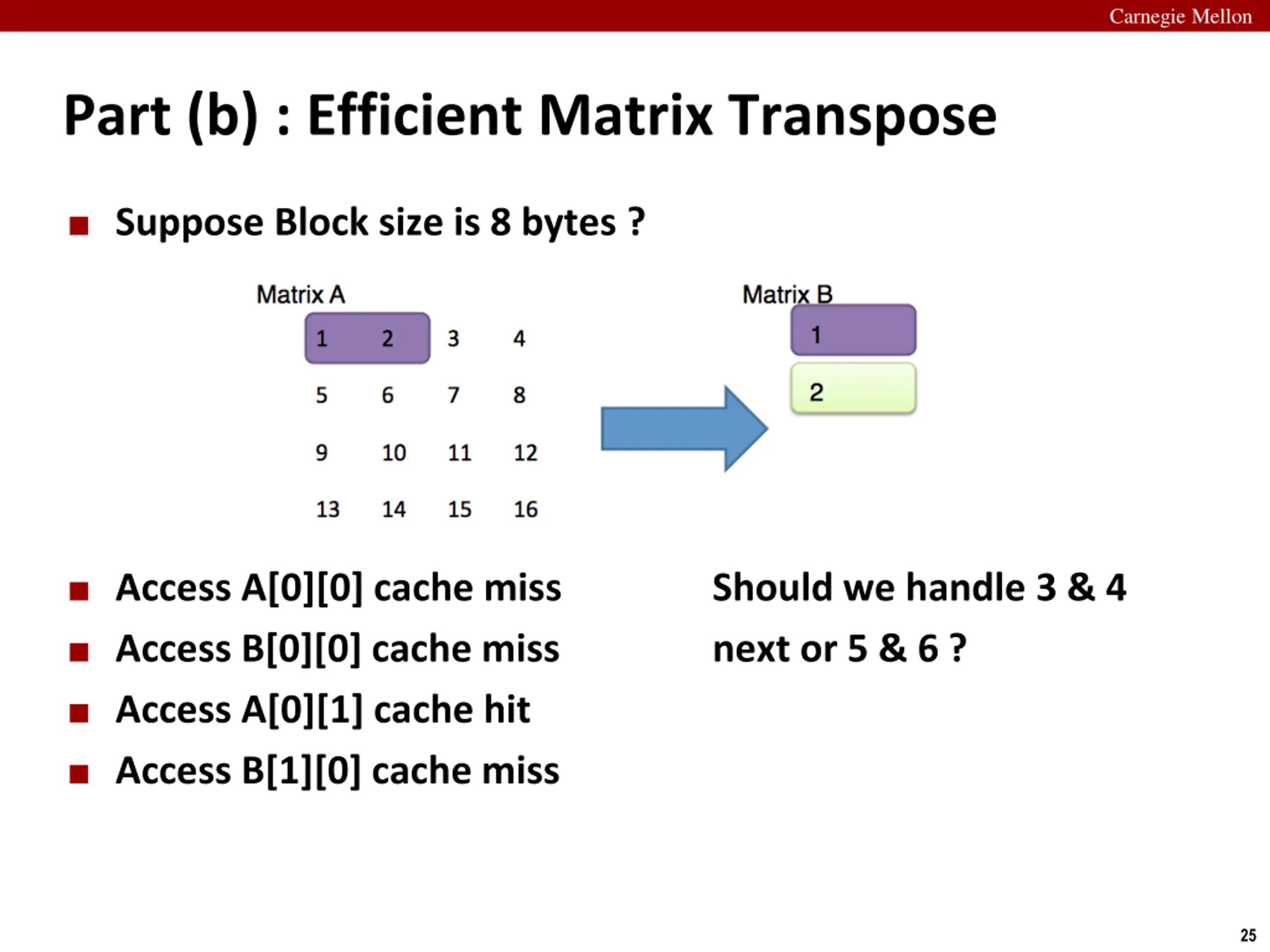 Carnegie Mellon Part (b) : Efficient Matrix Transpose Suppose Block size is 8 bytes ? Access A[0][0] cache miss Should we handle 3 & 4 next or 5 & 6 ? Access B[0][0] cache miss Access A[0][1] cache hit Access B[1][0] cache miss 25