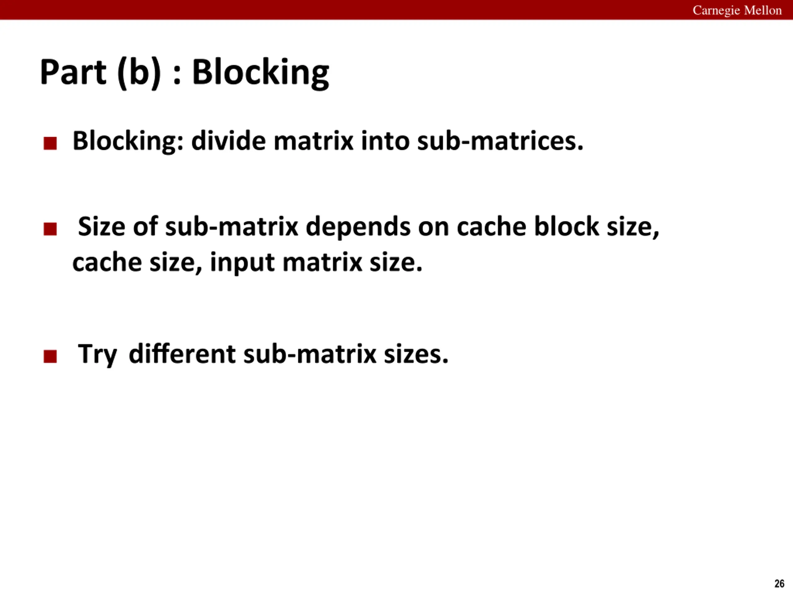 Carnegie Mellon Part (b) : Blocking Blocking: divide matrix into sub-matrices. Size of sub-matrix depends on cache block size, cache size, input matrix size. Try different sub-matrix sizes. 26