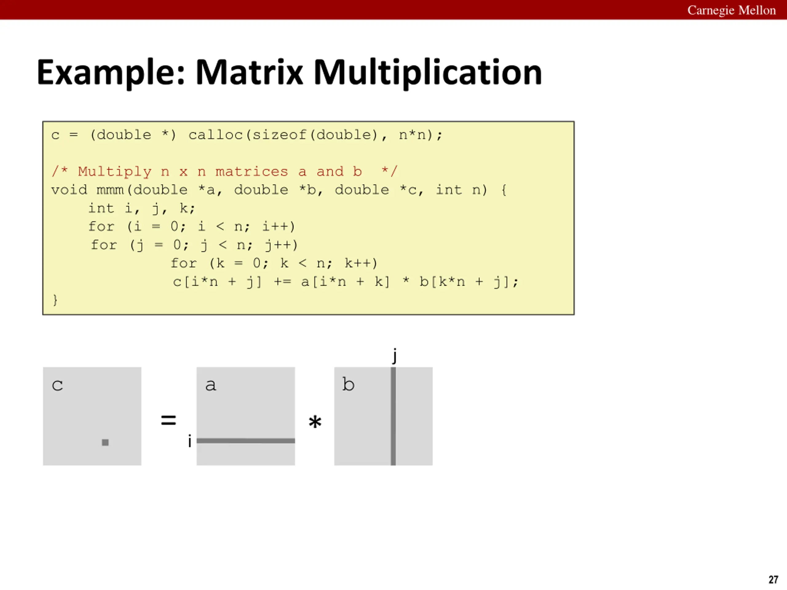 Carnegie Mellon Example: Matrix Multiplication c = (double *) calloc(sizeof(double), n*n); /* Multiply n x n matrices a and b */ void mmm(double *a, double *b, double *c, int n) { int i, j, k; for (i = 0; i < n; i++) for (j = 0; j < n; j++) for (k = 0; k < n; k++) c[i*n + j] += a[i*n + k] * b[k*n + j]; } j c a b = * i 27