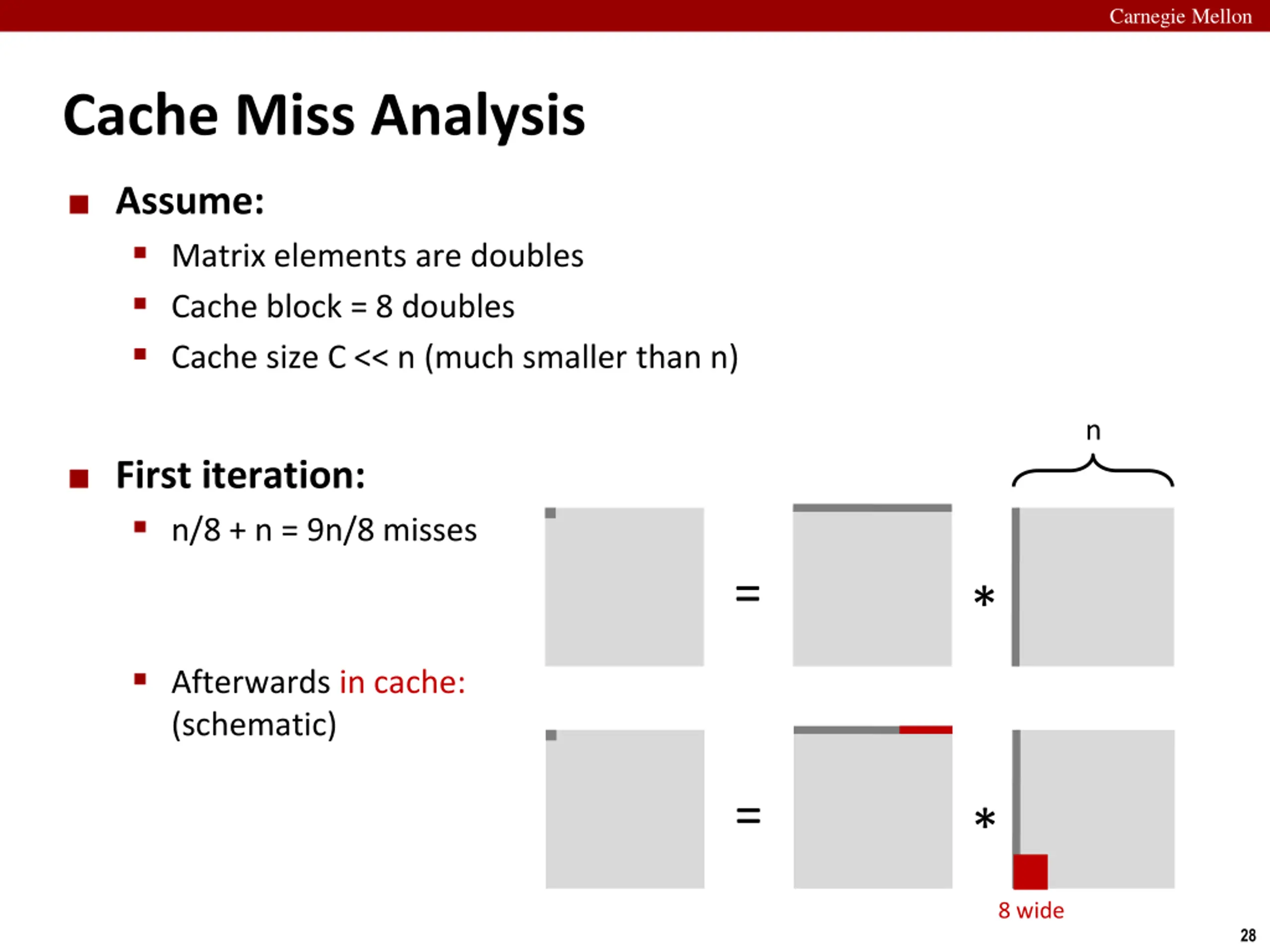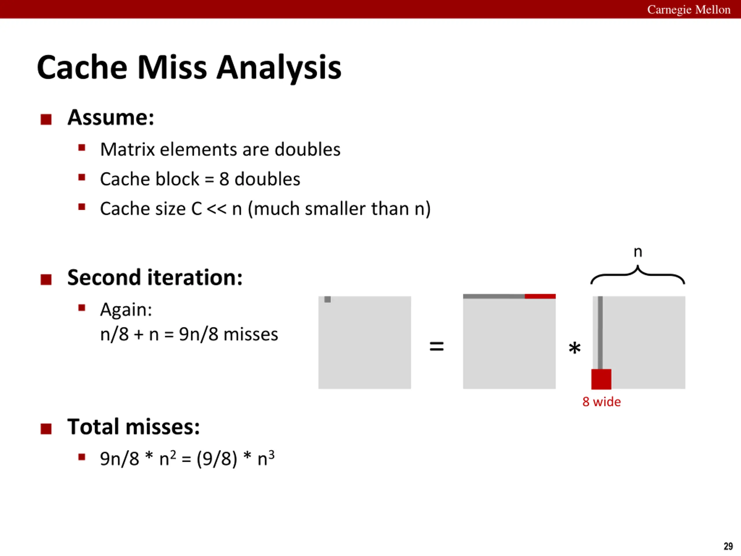 Carnegie Mellon Cache Miss Analysis Assume: Matrix elements are doubles Cache block = 8 doubles Cache size C << n (much smaller than n) n First iteration: n/8 + n = 9n/8 misses = * Afterwards in cache: (schematic) = * 8 wide 28