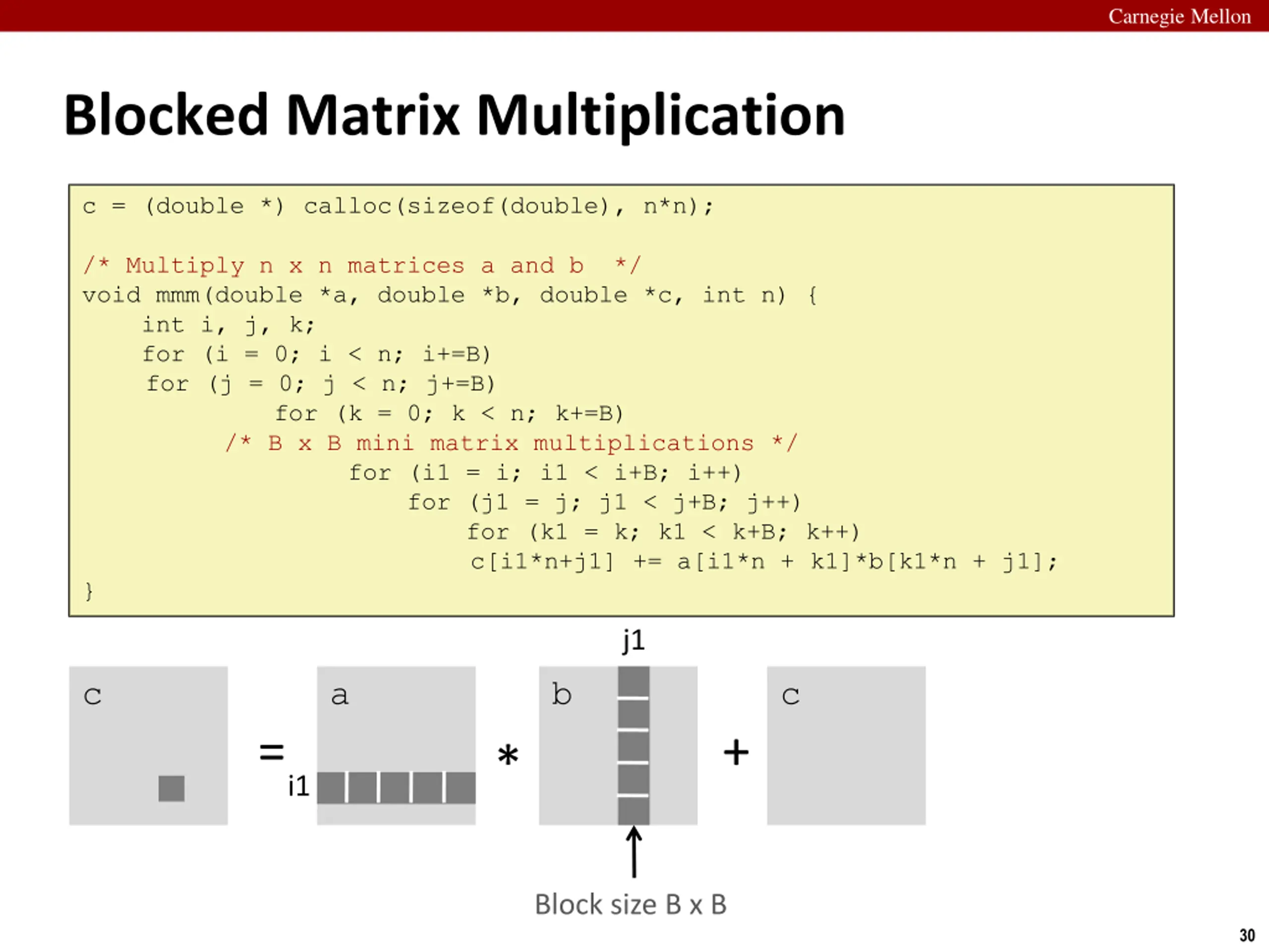 Carnegie Mellon Blocked Matrix Multiplication c = (double *) calloc(sizeof(double), n*n); /* Multiply n x n matrices a and b */ void mmm(double *a, double *b, double *c, int n) { int i, j, k; for (i = 0; i < n; i+=B) for (j = 0; j < n; j+=B) for (k = 0; k < n; k+=B) /* B x B mini matrix multiplications */ for (i1 = i; i1 < i+B; i++) for (j1 = j; j1 < j+B; j++) for (k1 = k; k1 < k+B; k++) c[i1*n+j1] += a[i1*n + k1]*b[k1*n + j1]; } j1 c a b c = + * i1 Block size B x B 30