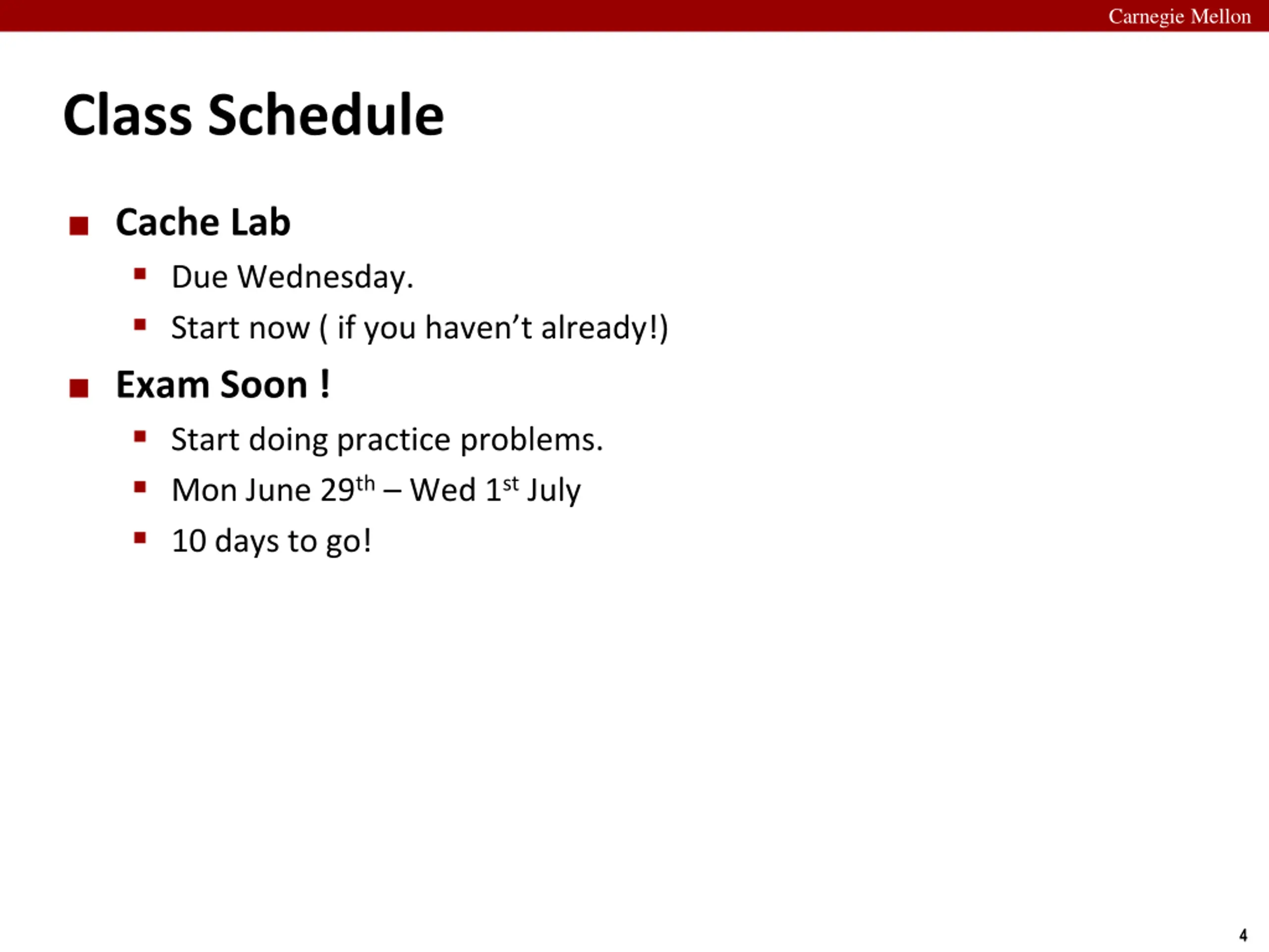 Carnegie Mellon Class Schedule Cache Lab Due Wednesday. Start now ( if you haven t already!) Exam Soon ! Start doing practice problems. Mon June 29th Wed 1st July 10 days to go! 4