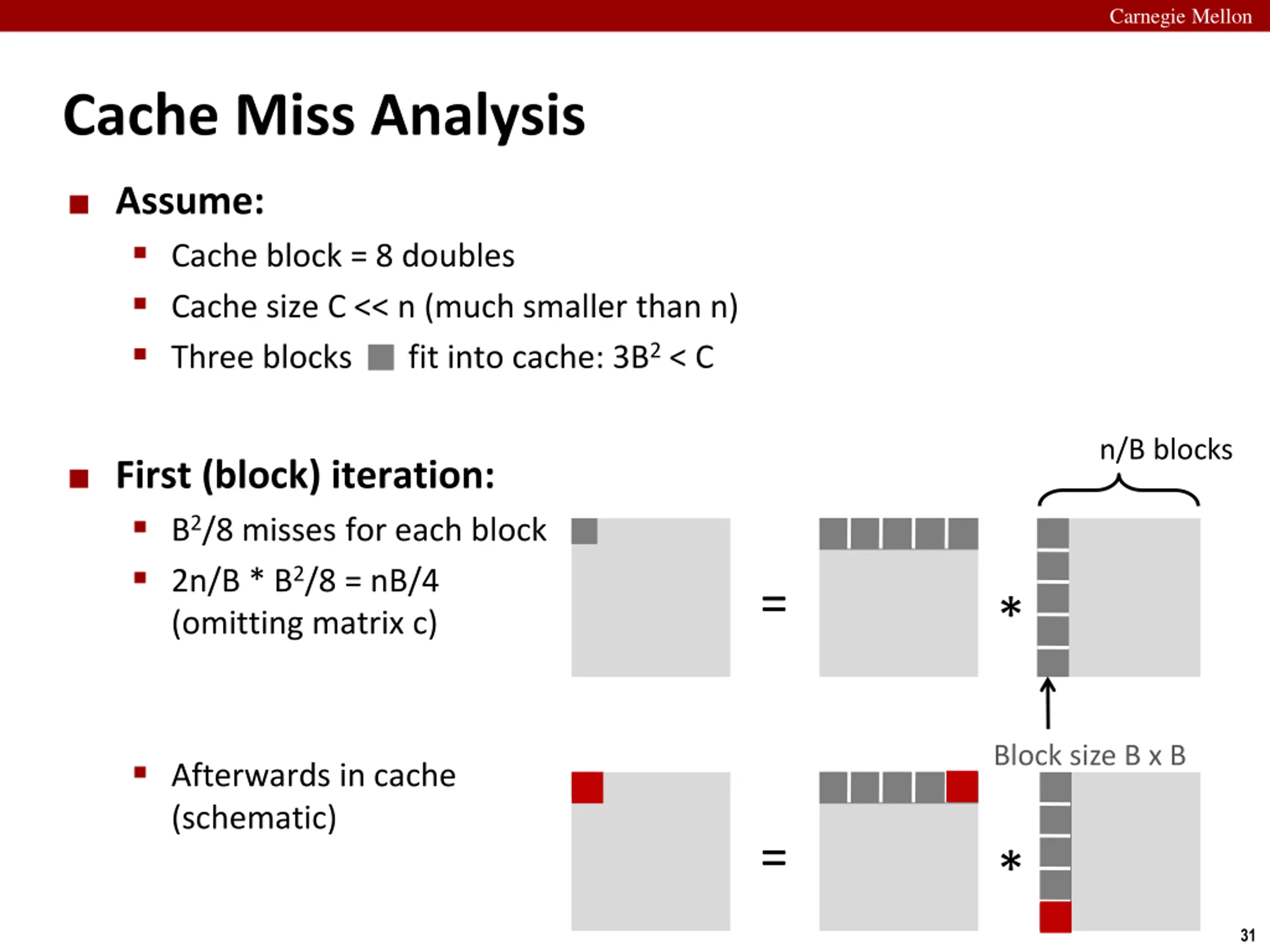 Carnegie Mellon Cache Miss Analysis Assume: Cache block = 8 doubles Cache size C << n (much smaller than n) Three blocks fit into cache: 3B2 < C n/B blocks Second (block) iteration: Same as first iteration 2n/B * B2/8 = nB/4 = * Total misses: nB/4 * (n/B)2 = n3/(4B) Block size B x B 32
