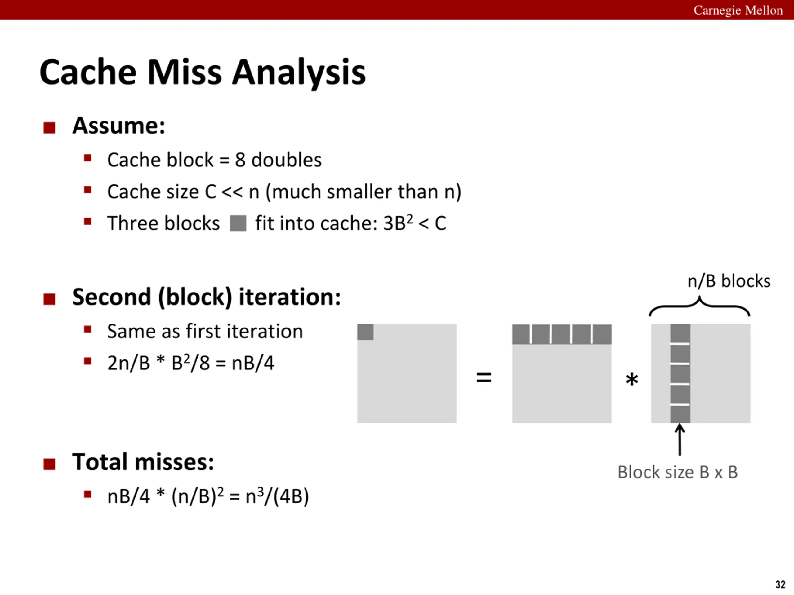 Carnegie Mellon Cache Miss Analysis Assume: Cache block = 8 doubles Cache size C << n (much smaller than n) Three blocks fit into cache: 3B2 < C n/B blocks First (block) iteration: B2/8 misses for each block 2n/B * B2/8 = nB/4 (omitting matrix c) = * Block size B x B Afterwards in cache (schematic) = * 31