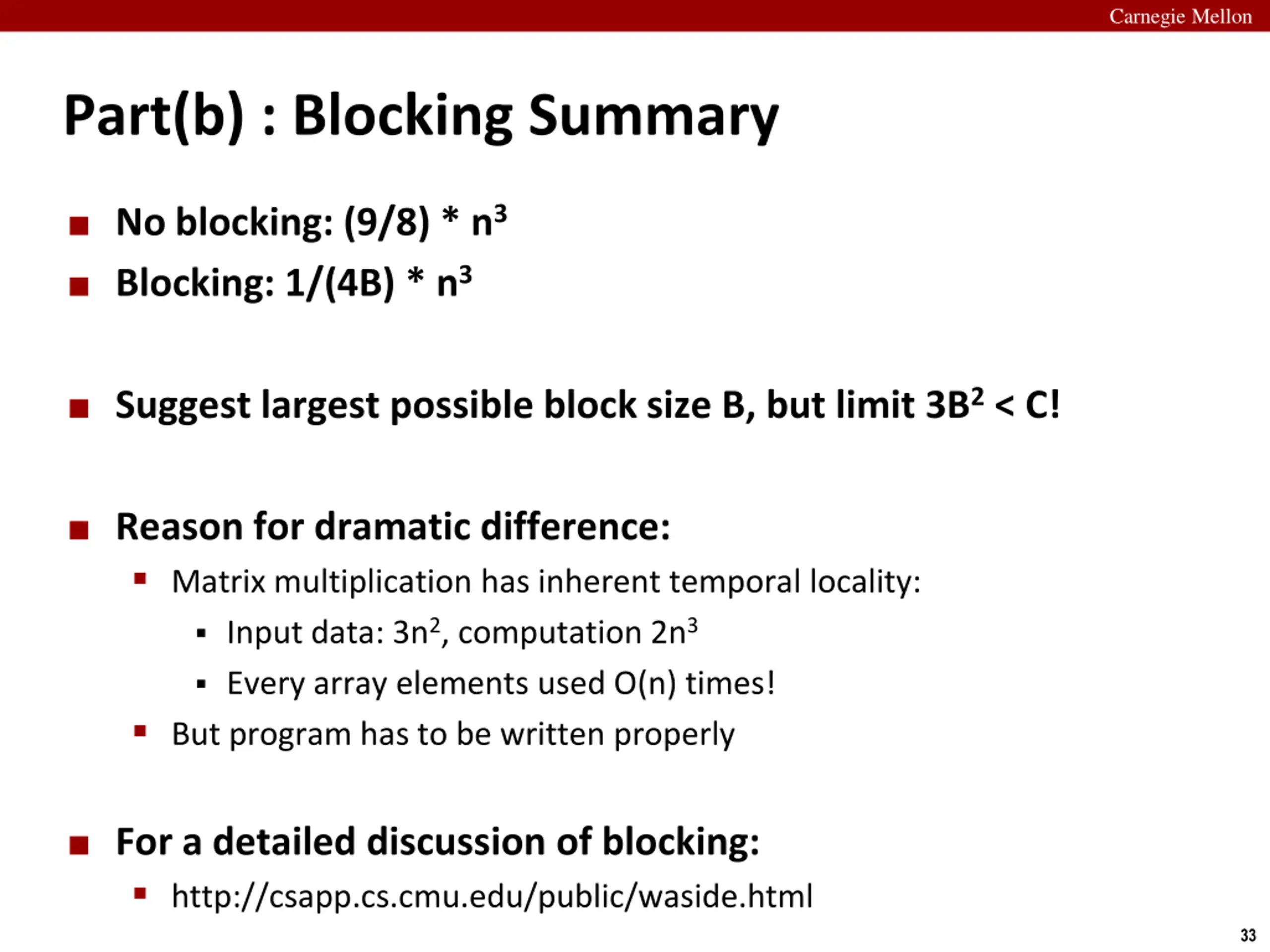 Carnegie Mellon Part(b) : Blocking Summary No blocking: (9/8) * n3 Blocking: 1/(4B) * n3 Suggest largest possible block size B, but limit 3B2 < C! Reason for dramatic difference: Matrix multiplication has inherent temporal locality: Input data: 3n2, computation 2n3 Every array elements used O(n) times! But program has to be written properly For a detailed discussion of blocking: http://csapp.cs.cmu.edu/public/waside.html 33