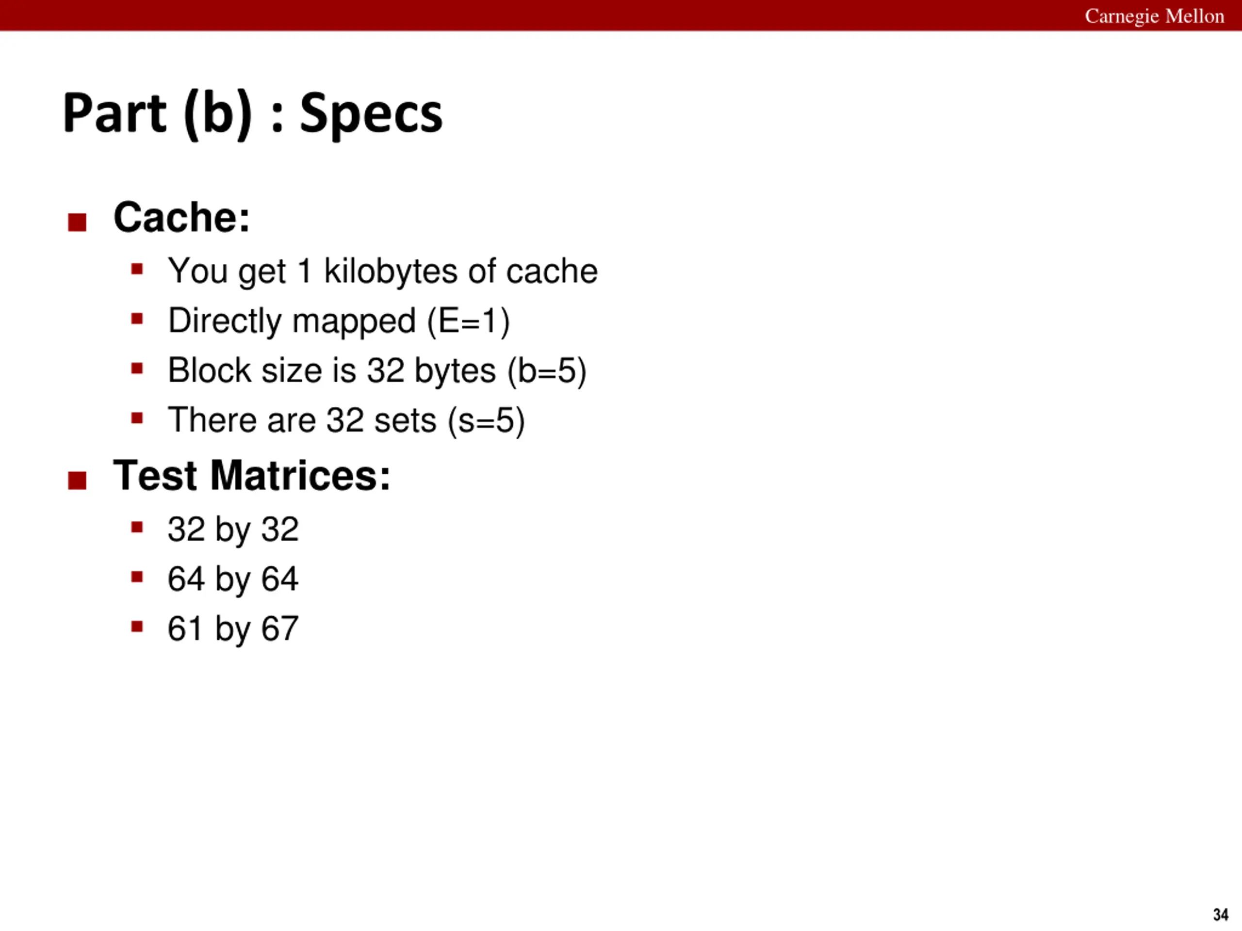 Carnegie Mellon Part (b) : Specs Cache: You get 1 kilobytes of cache Directly mapped (E=1) Block size is 32 bytes (b=5) There are 32 sets (s=5) Test Matrices: 32 by 32 64 by 64 61 by 67 34