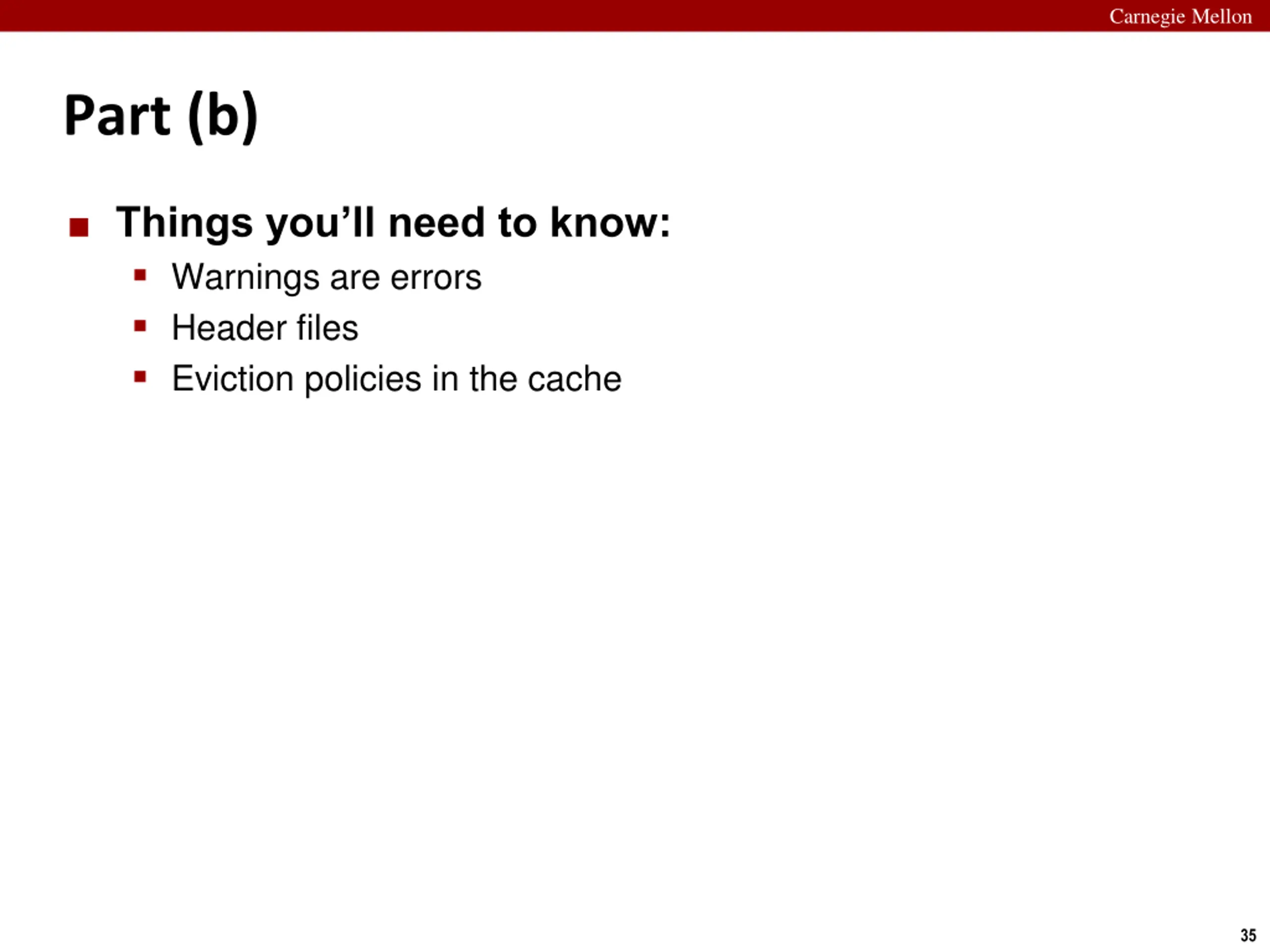 Carnegie Mellon Part (b) Things you ll need to know: Warnings are errors Header files Eviction policies in the cache 35
