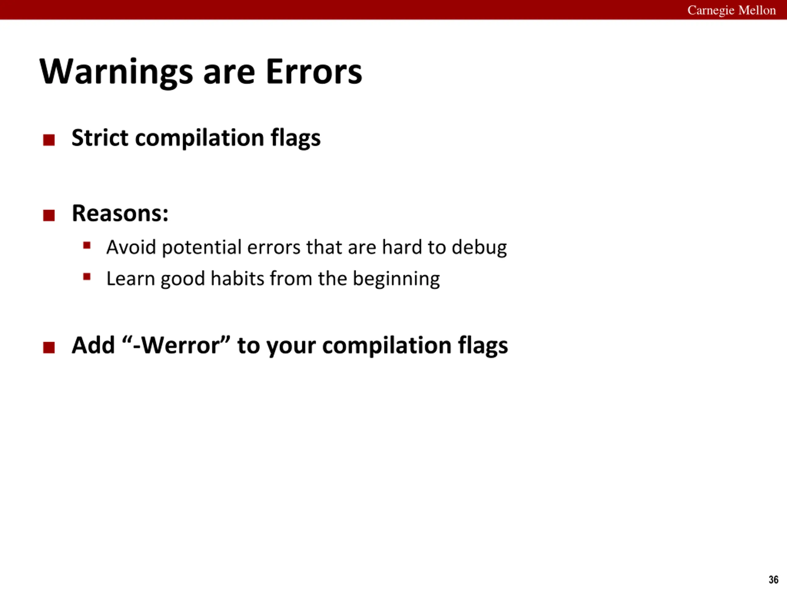 Carnegie Mellon Warnings are Errors Strict compilation flags Reasons: Avoid potential errors that are hard to debug Learn good habits from the beginning Add -Werror to your compilation flags 36