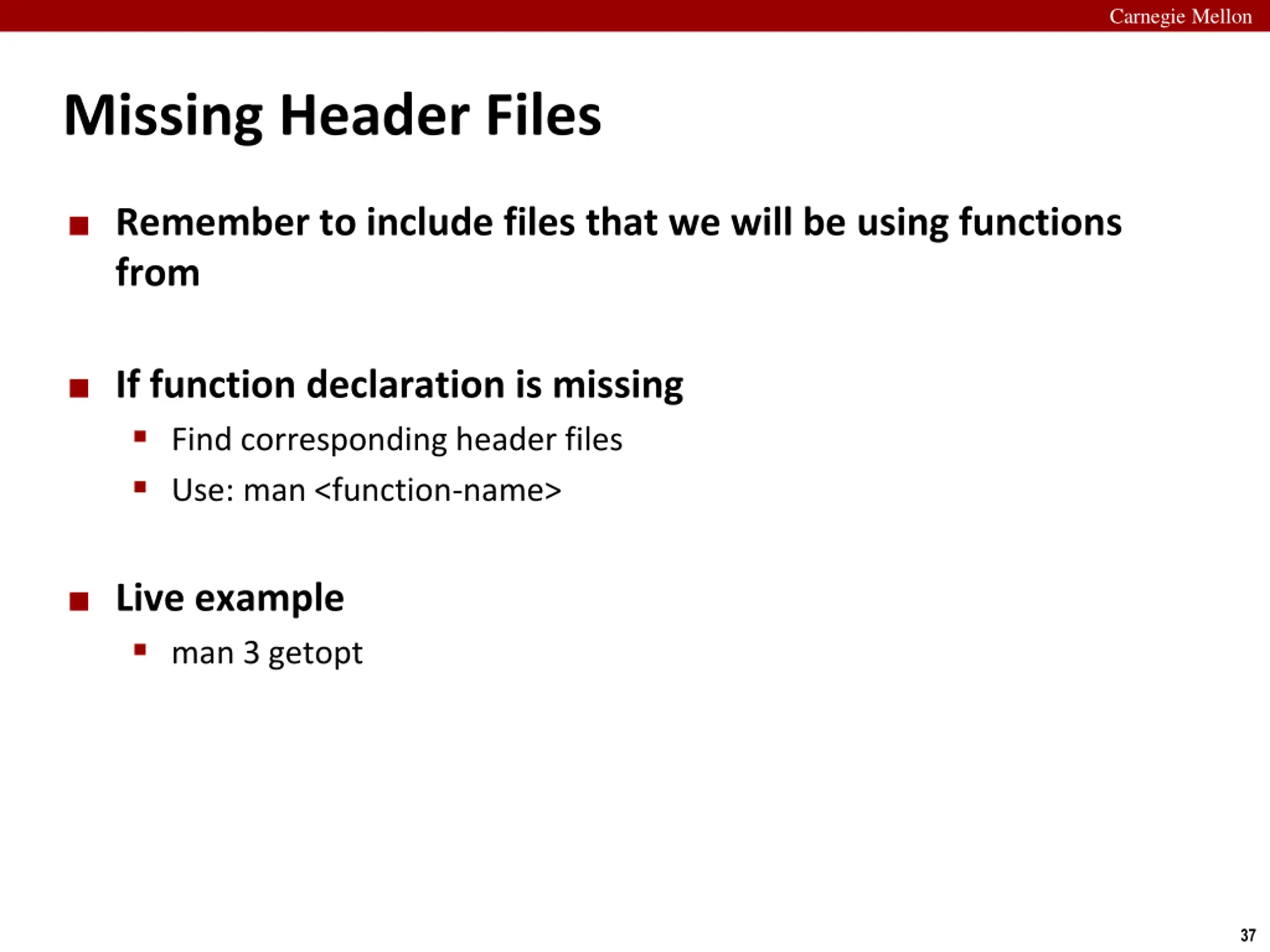Carnegie Mellon Missing Header Files Remember to include files that we will be using functions from If function declaration is missing Find corresponding header files Use: man <function-name> Live example man 3 getopt 37