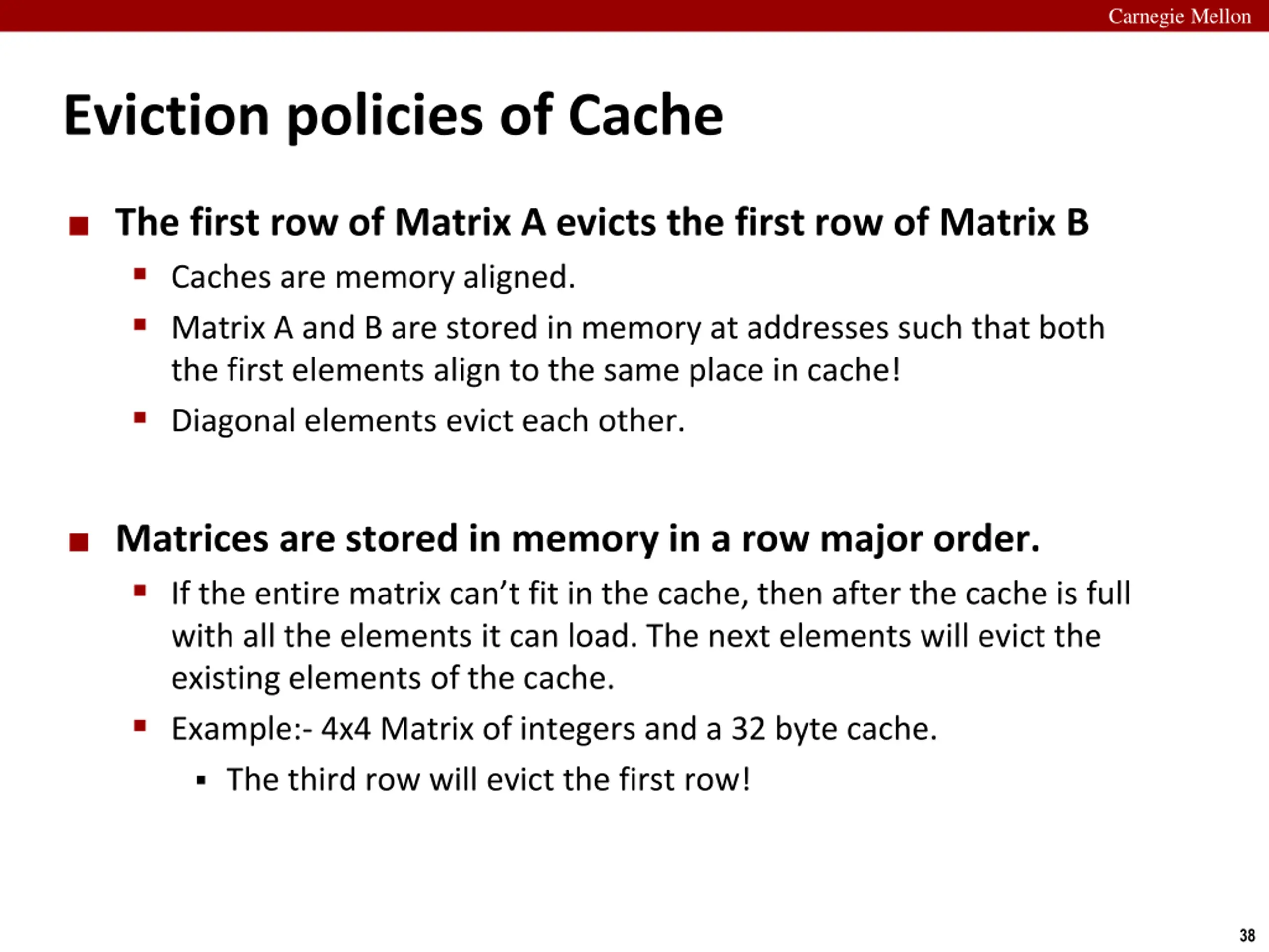 Carnegie Mellon Eviction policies of Cache The first row of Matrix A evicts the first row of Matrix B Caches are memory aligned. Matrix A and B are stored in memory at addresses such that both the first elements align to the same place in cache! Diagonal elements evict each other. Matrices are stored in memory in a row major order. If the entire matrix can t fit in the cache, then after the cache is full with all the elements it can load. The next elements will evict the existing elements of the cache. Example:- 4x4 Matrix of integers and a 32 byte cache. The third row will evict the first row! 38
