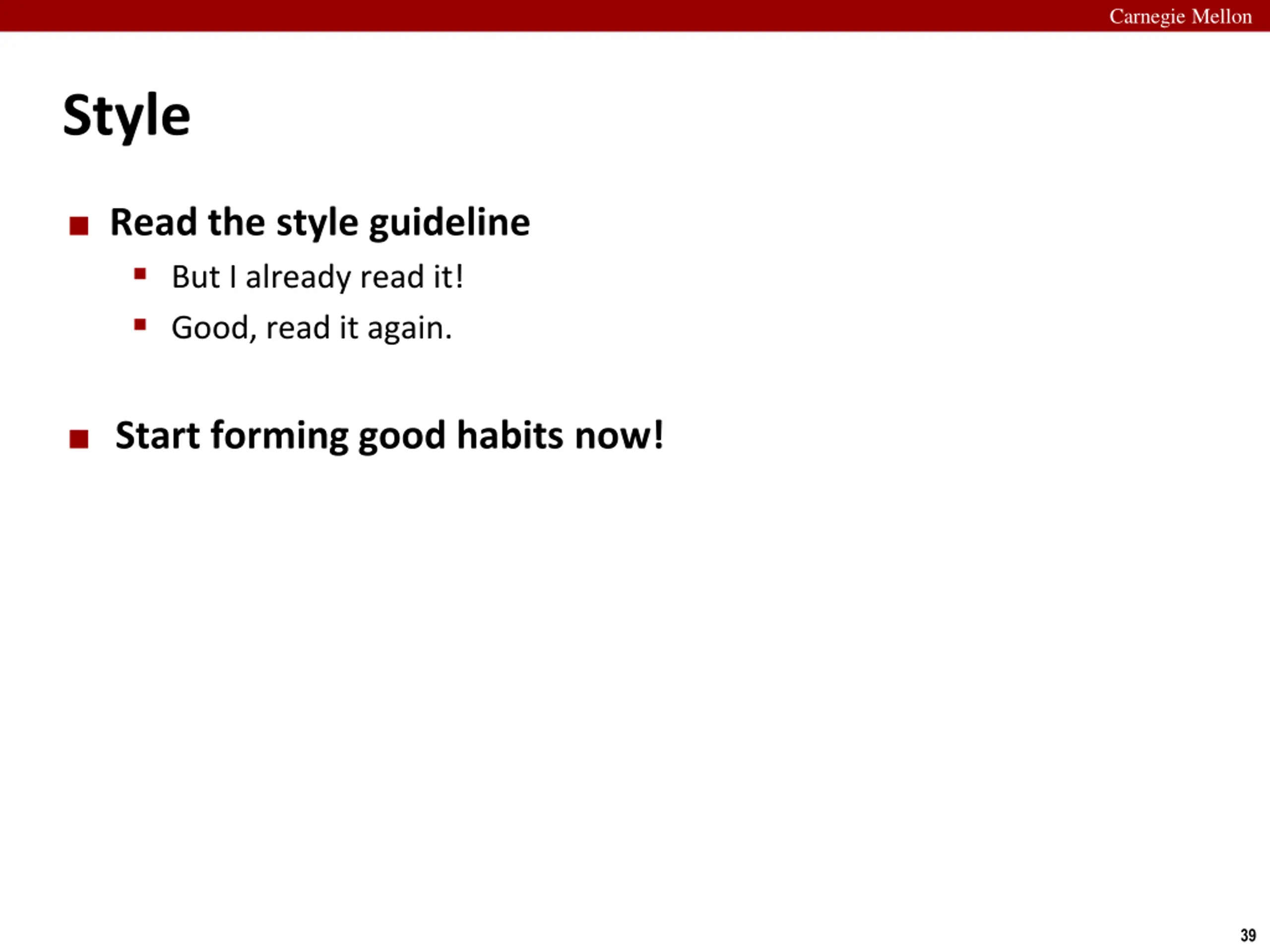 Carnegie Mellon Style Read the style guideline But I already read it! Good, read it again. Start forming good habits now! 39