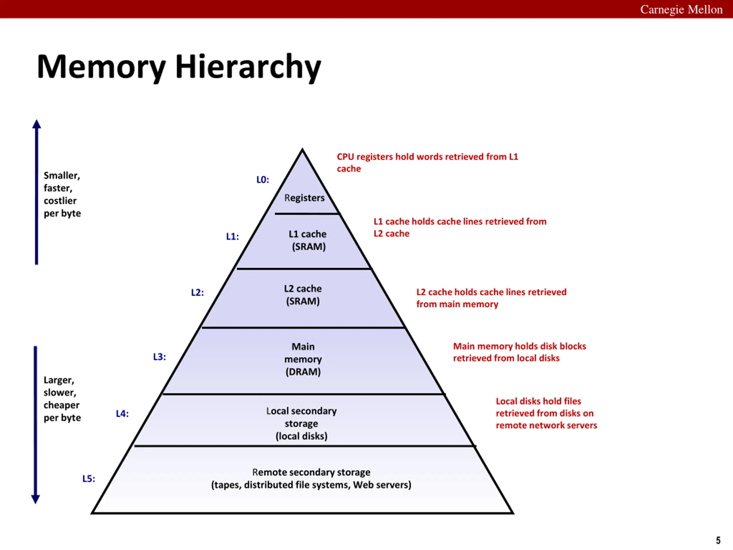 Carnegie Mellon Memory Hierarchy CPU registers hold words retrieved from L1 cache Smaller, faster, costlier per byte L0: Registers L1 cache holds cache lines retrieved from L2 cache L1 cache (SRAM) L1: L2 cache (SRAM) L2 cache holds cache lines retrieved from main memory L2: Main memory holds disk blocks retrieved from local disks Main memory (DRAM) L3: Larger, slower, cheaper per byte Local disks hold files retrieved from disks on remote network servers Local secondary storage (local disks) L4: Remote secondary storage (tapes, distributed file systems, Web servers) L5: 5