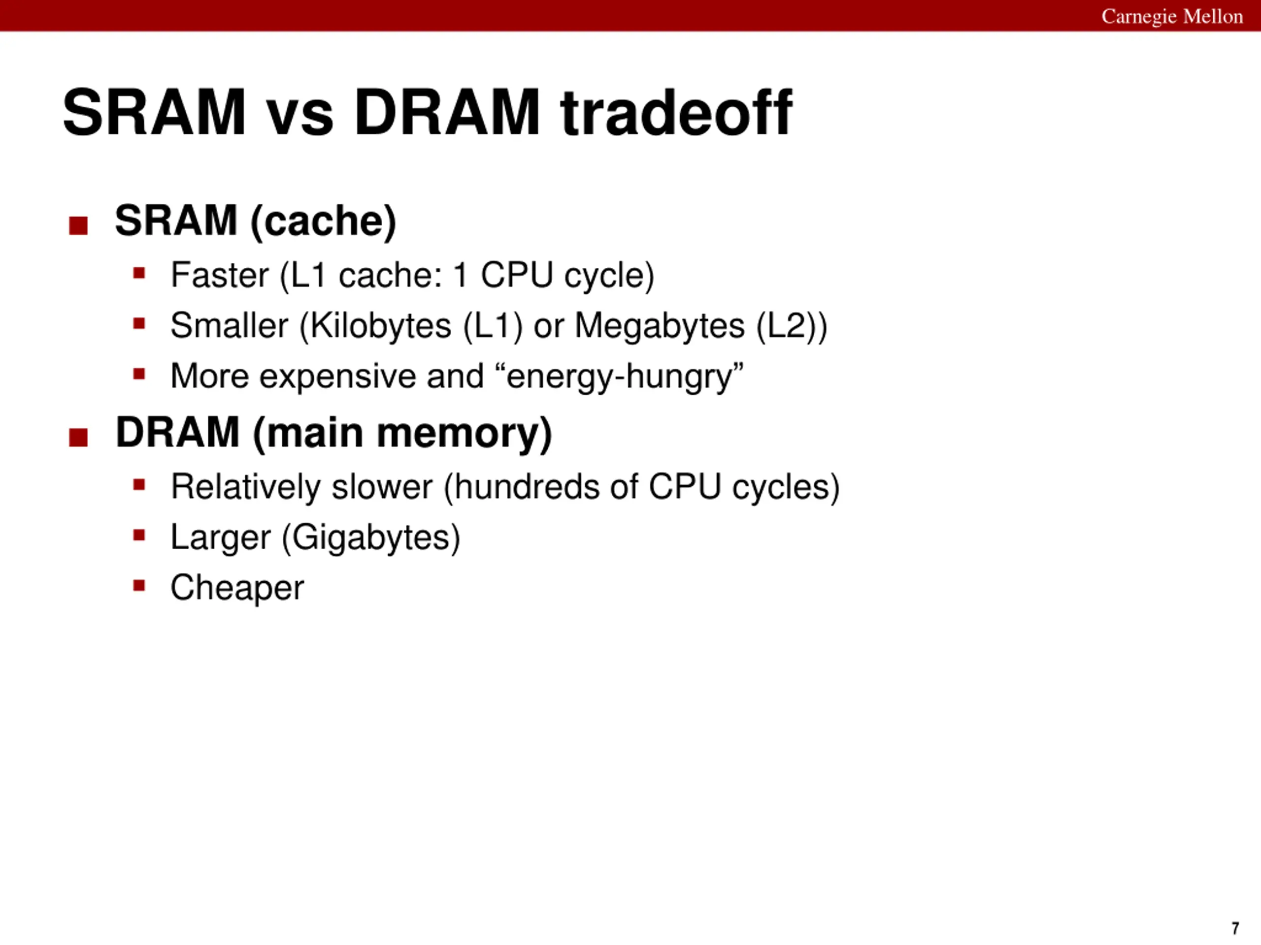 Carnegie Mellon Memory Hierarchy Registers SRAM We will discuss this interaction DRAM Local Secondary storage Remote Secondary storage 6