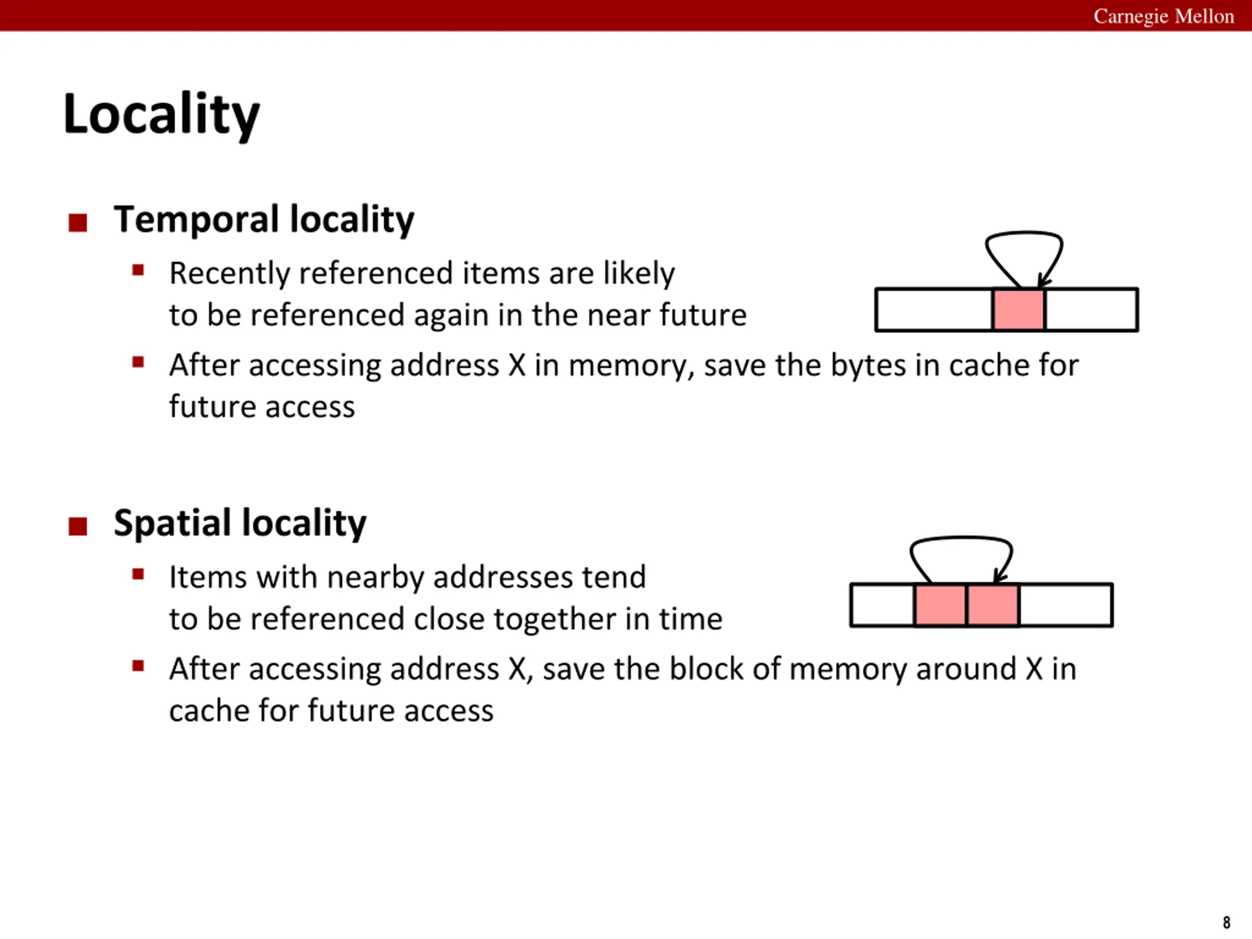 Carnegie Mellon Locality Temporal locality Recently referenced items are likely to be referenced again in the near future After accessing address X in memory, save the bytes in cache for future access Spatial locality Items with nearby addresses tend to be referenced close together in time After accessing address X, save the block of memory around X in cache for future access 8