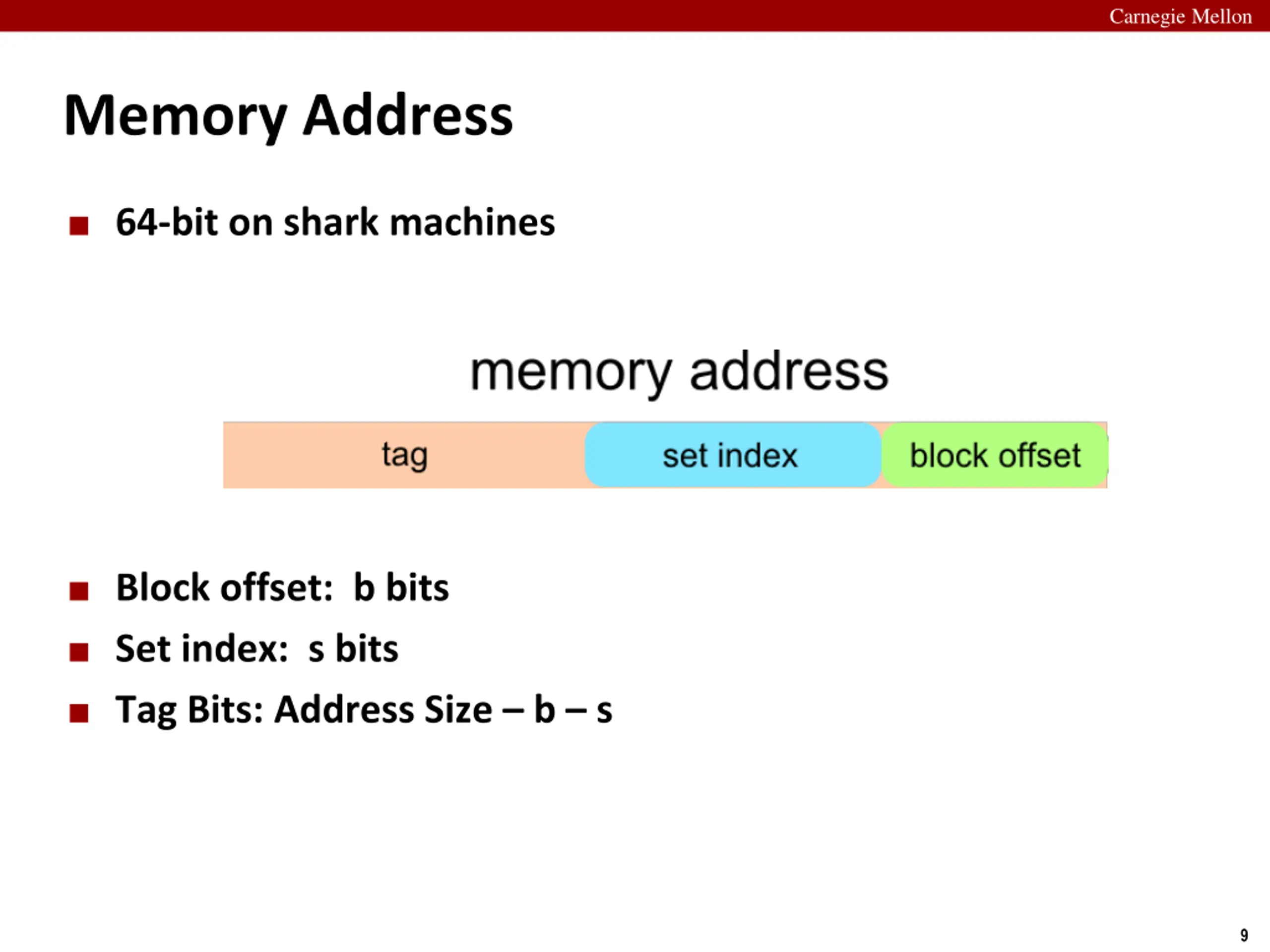 Carnegie Mellon Memory Address 64-bit on shark machines Block offset: b bits Set index: s bits Tag Bits: Address Size b s 9