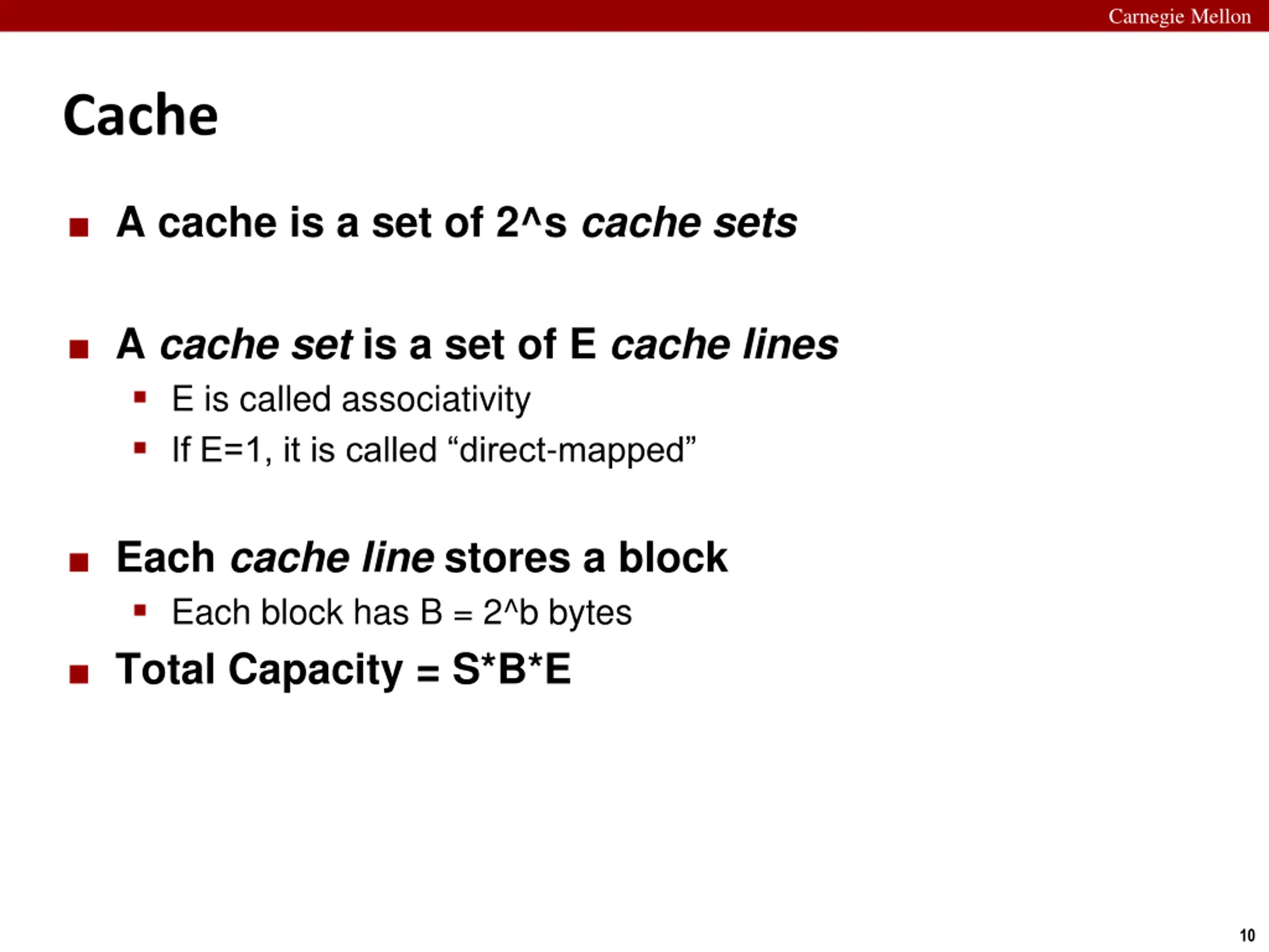 Carnegie Mellon Cache A cache is a set of 2^s cache sets A cache set is a set of E cache lines E is called associativity If E=1, it is called direct-mapped Each cache line stores a block Each block has B = 2^b bytes Total Capacity = S*B*E 10