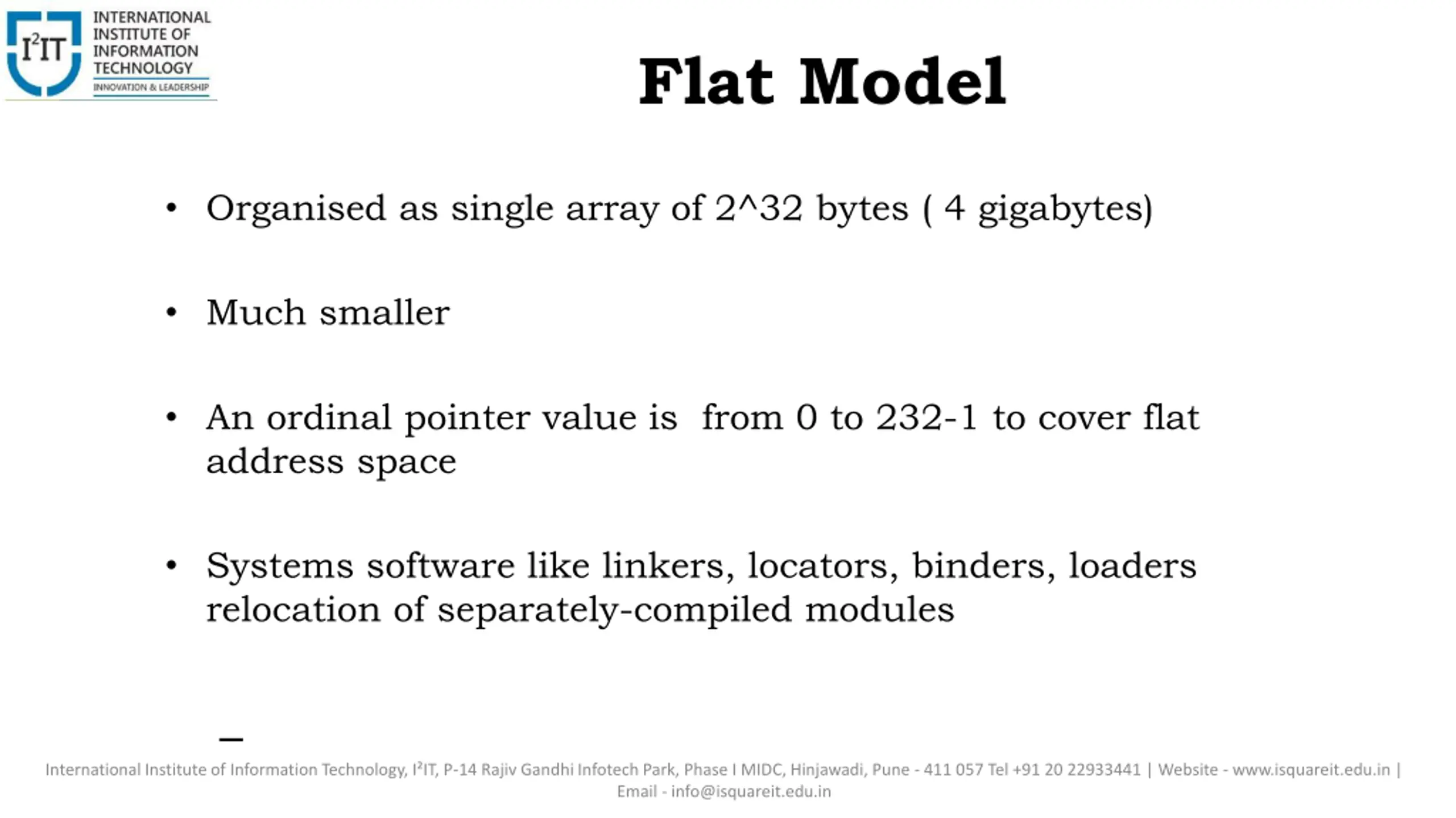 Flat Model Organised as single array of 2^32 bytes ( 4 gigabytes) Much smaller An ordinal pointer value is from 0 to 232-1 to cover flat address space Systems software like linkers, locators, binders, loaders relocation of separately-compiled modules International Institute of Information Technology, I IT, P-14 Rajiv Gandhi Infotech Park, Phase I MIDC, Hinjawadi, Pune - 411 057 Tel +91 20 22933441 | Website - www.isquareit.edu.in | Email - info@isquareit.edu.in