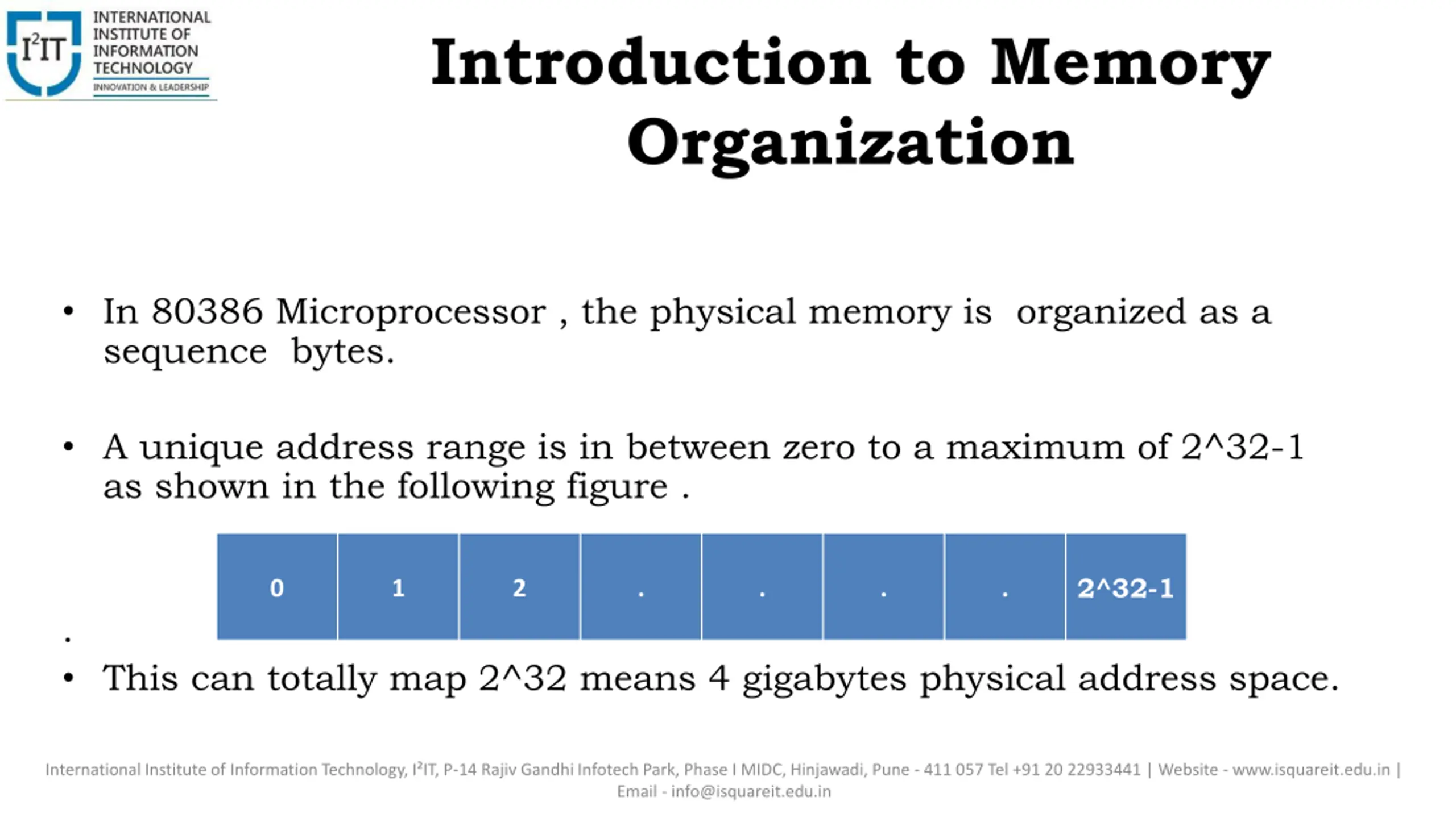Introduction to Memory Organization In 80386 Microprocessor , the physical memory is organized as a sequence bytes. A unique address range is in between zero to a maximum of 2^32-1 as shown in the following figure . 2^32-1 0 1 2 . . . . . This can totally map 2^32 means 4 gigabytes physical address space. International Institute of Information Technology, I IT, P-14 Rajiv Gandhi Infotech Park, Phase I MIDC, Hinjawadi, Pune - 411 057 Tel +91 20 22933441 | Website - www.isquareit.edu.in | Email - info@isquareit.edu.in