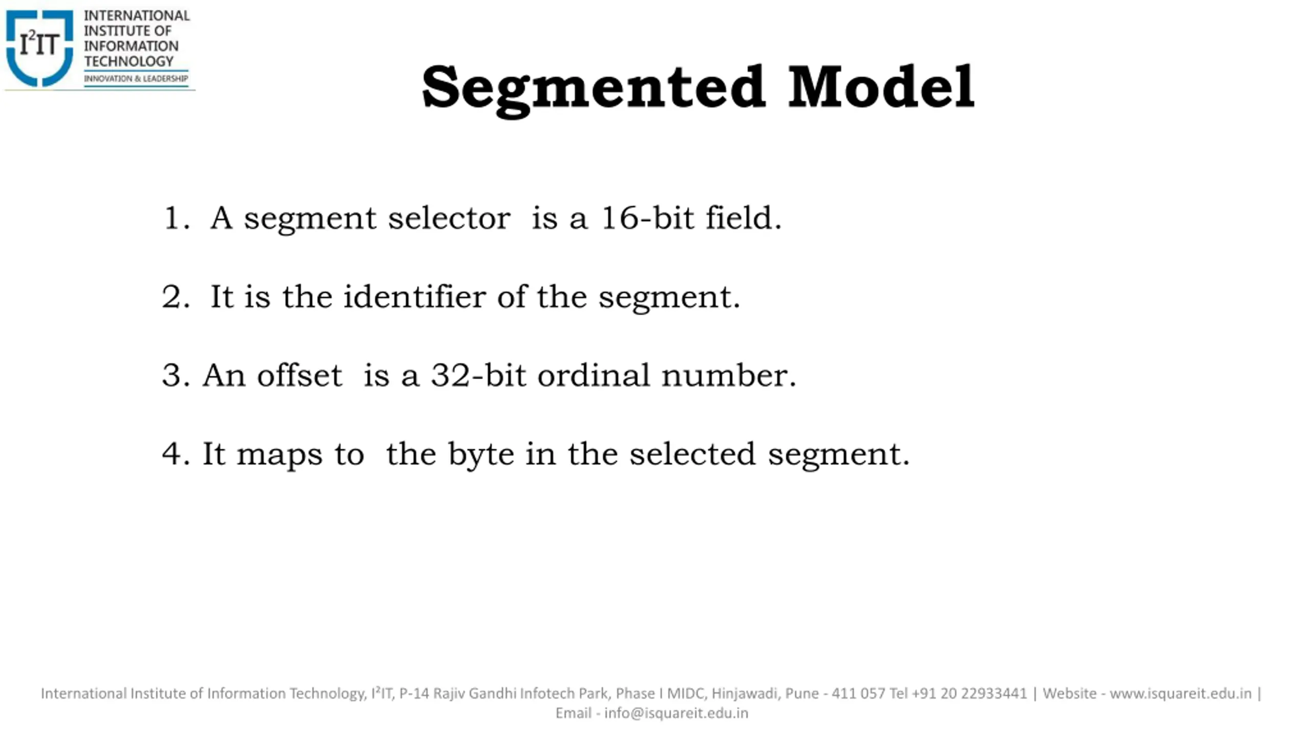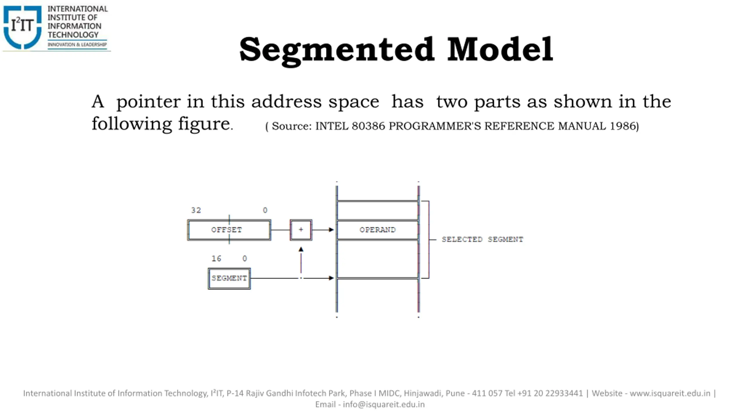 Segmented Model A pointer in this address space has two parts as shown in the following figure. ( Source: INTEL 80386 PROGRAMMER'S REFERENCE MANUAL 1986) International Institute of Information Technology, I IT, P-14 Rajiv Gandhi Infotech Park, Phase I MIDC, Hinjawadi, Pune - 411 057 Tel +91 20 22933441 | Website - www.isquareit.edu.in | Email - info@isquareit.edu.in