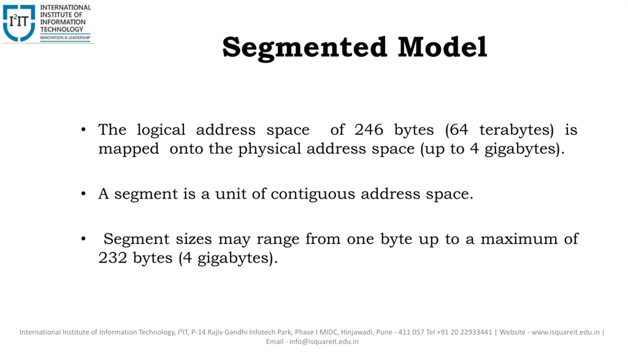 Segmented Model The logical address space of 246 bytes (64 terabytes) is mapped onto the physical address space (up to 4 gigabytes). A segment is a unit of contiguous address space. Segment sizes may range from one byte up to a maximum of 232 bytes (4 gigabytes). International Institute of Information Technology, I IT, P-14 Rajiv Gandhi Infotech Park, Phase I MIDC, Hinjawadi, Pune - 411 057 Tel +91 20 22933441 | Website - www.isquareit.edu.in | Email - info@isquareit.edu.in