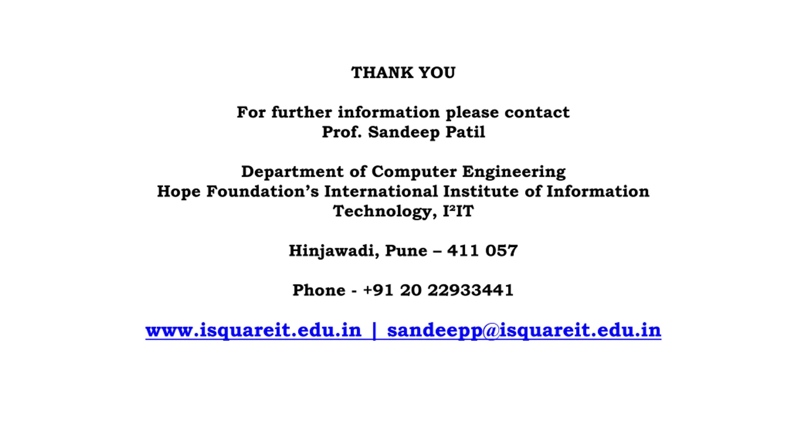 THANK YOU For further information please contact Prof. Sandeep Patil Department of Computer Engineering Hope Foundation s International Institute of Information Technology, I IT Hinjawadi, Pune 411 057 Phone - +91 20 22933441 www.isquareit.edu.in | sandeepp@isquareit.edu.in