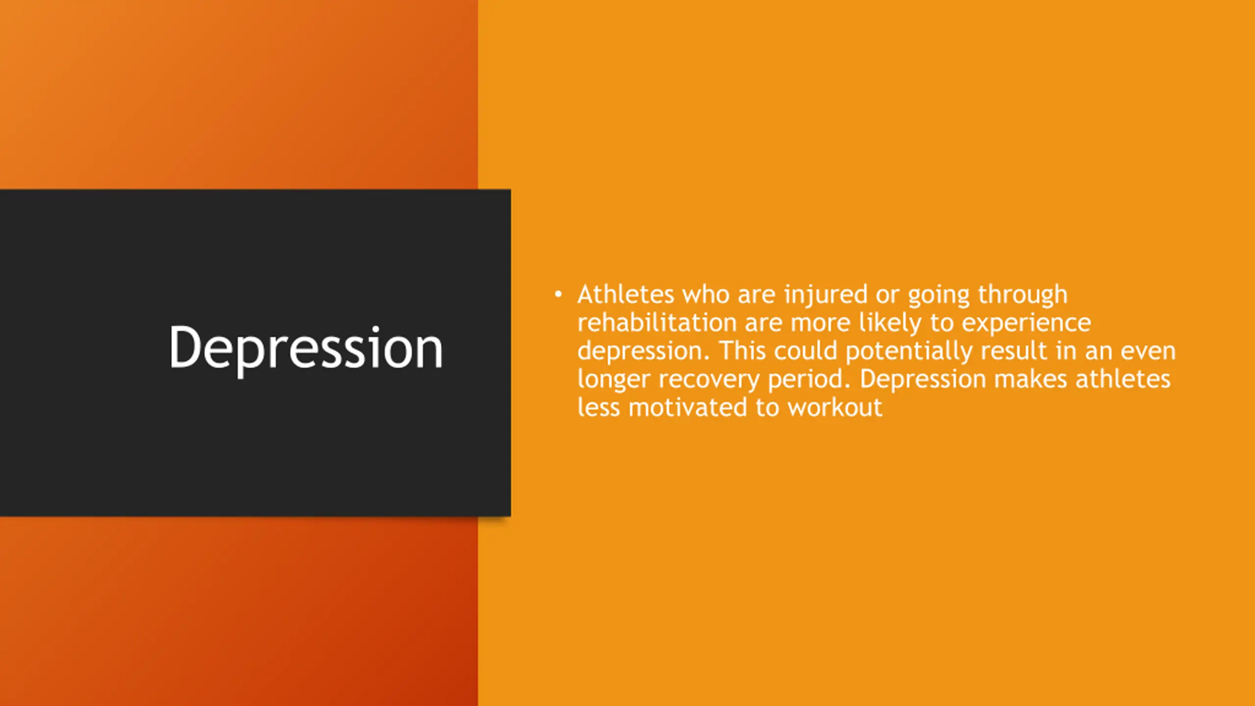 Athletes who are injured or going through rehabilitation are more likely to experience depression. This could potentially result in an even longer recovery period. Depression makes athletes less motivated to workout Depression