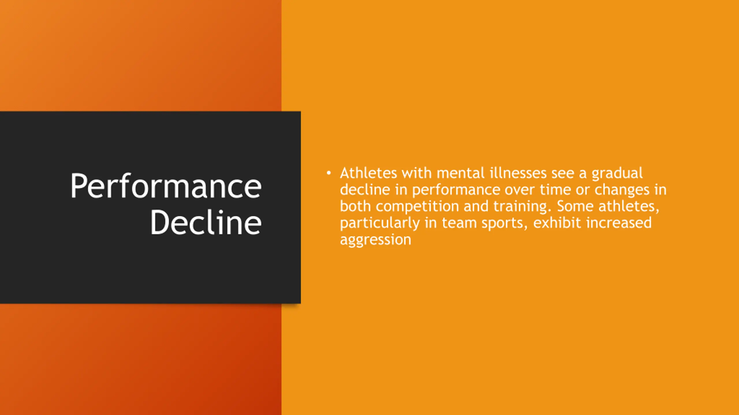 Athletes with mental illnesses see a gradual decline in performance over time or changes in both competition and training. Some athletes, particularly in team sports, exhibit increased aggression Performance Decline