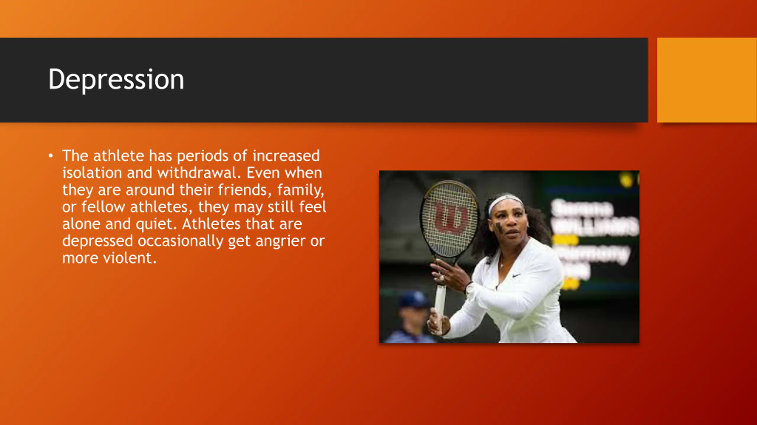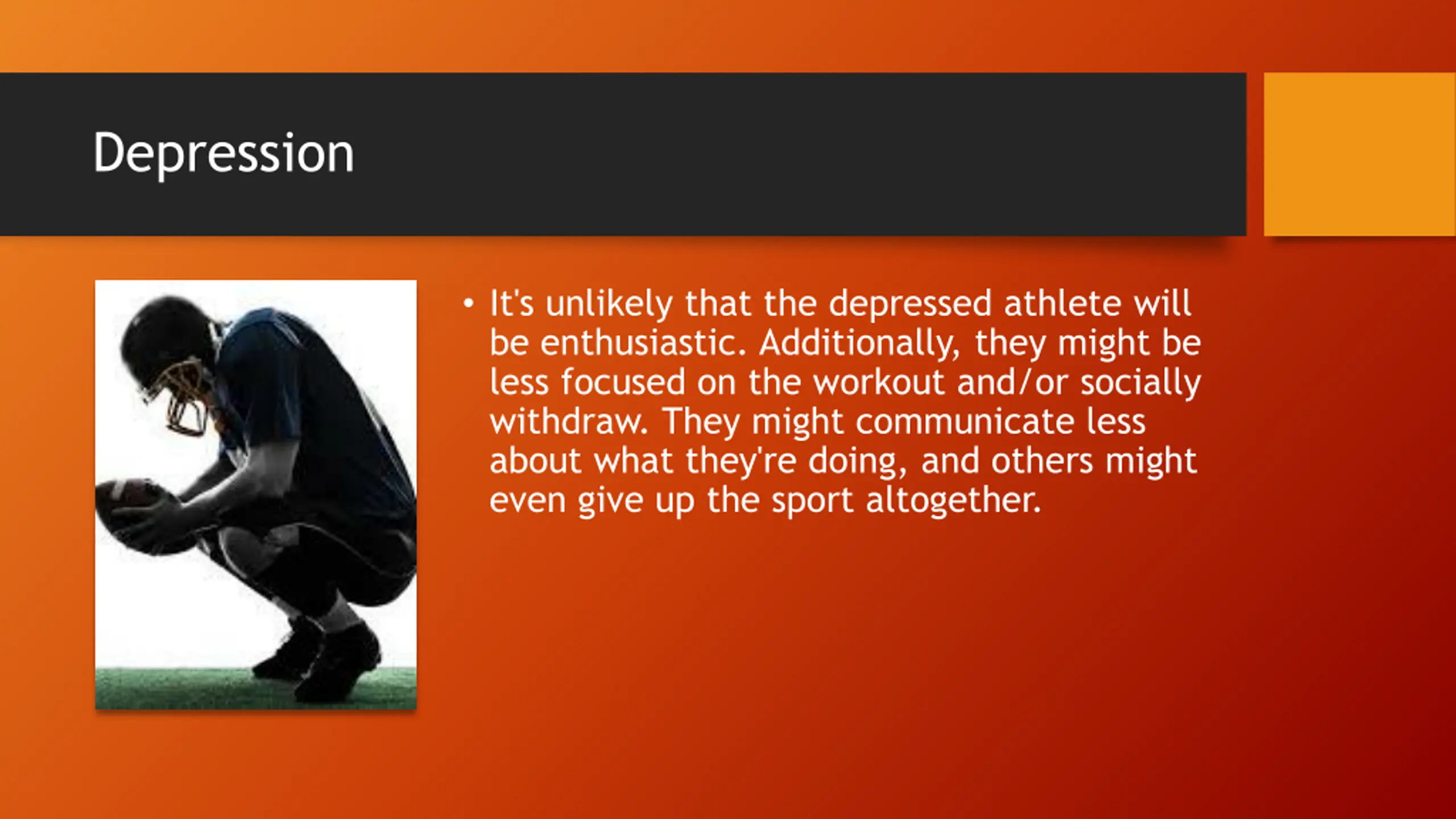 Depression The athlete has periods of increased isolation and withdrawal. Even when they are around their friends, family, or fellow athletes, they may still feel alone and quiet. Athletes that are depressed occasionally get angrier or more violent.