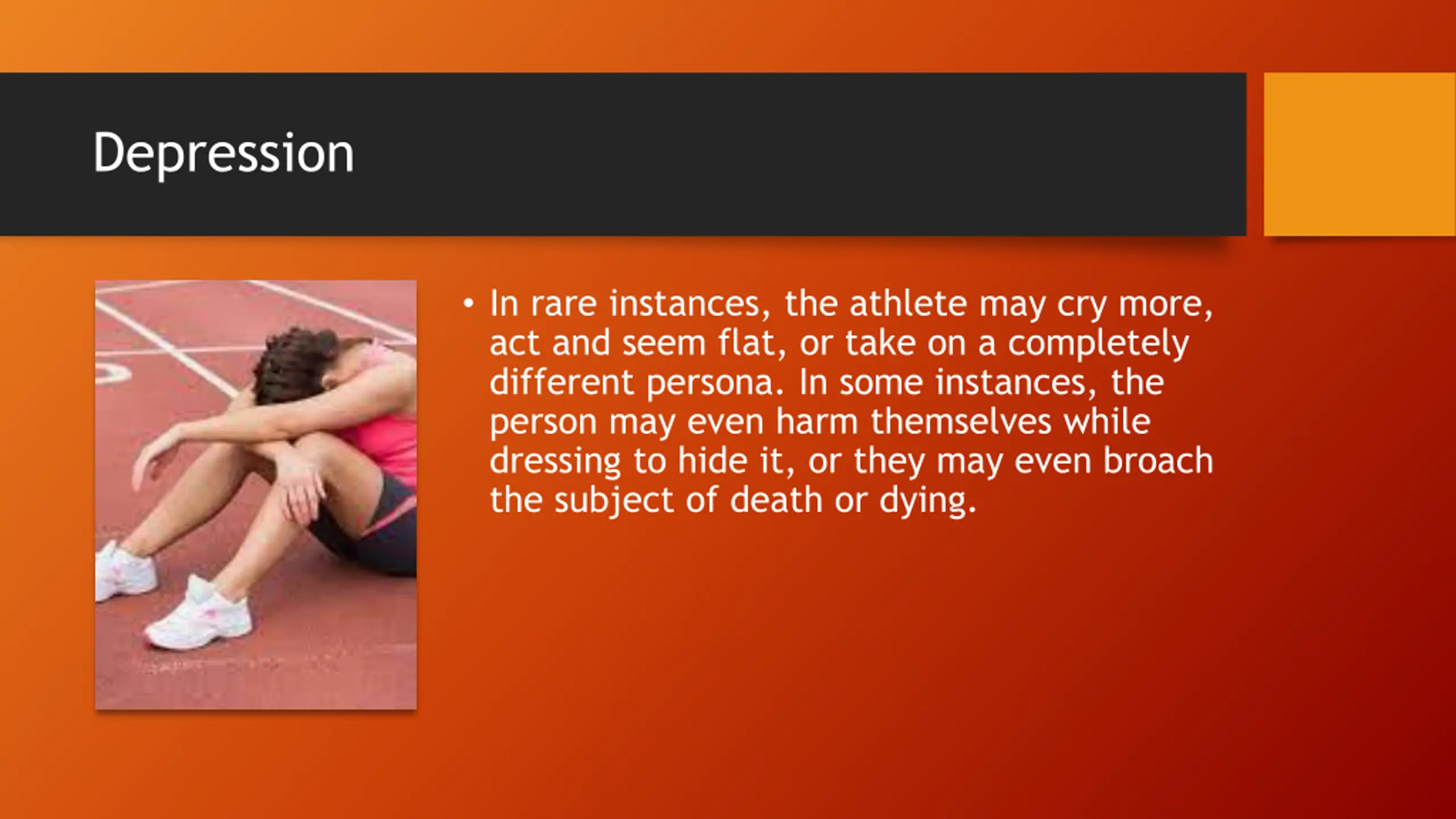 Depression In rare instances, the athlete may cry more, act and seem flat, or take on a completely different persona. In some instances, the person may even harm themselves while dressing to hide it, or they may even broach the subject of death or dying.