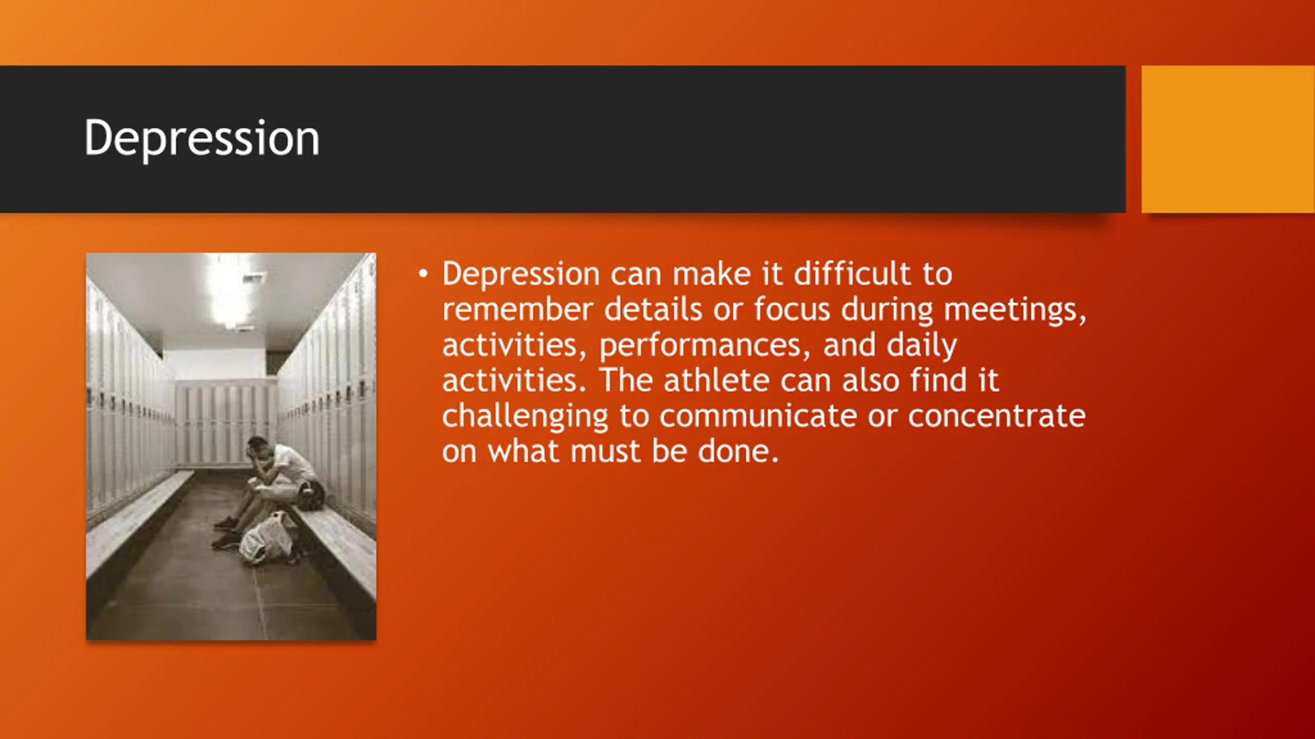Depression Depression can make it difficult to remember details or focus during meetings, activities, performances, and daily activities. The athlete can also find it challenging to communicate or concentrate on what must be done.