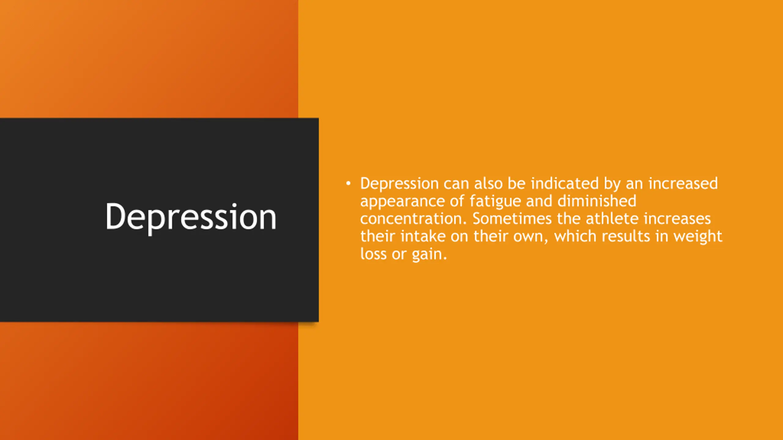 Depression can also be indicated by an increased appearance of fatigue and diminished concentration. Sometimes the athlete increases their intake on their own, which results in weight loss or gain. Depression