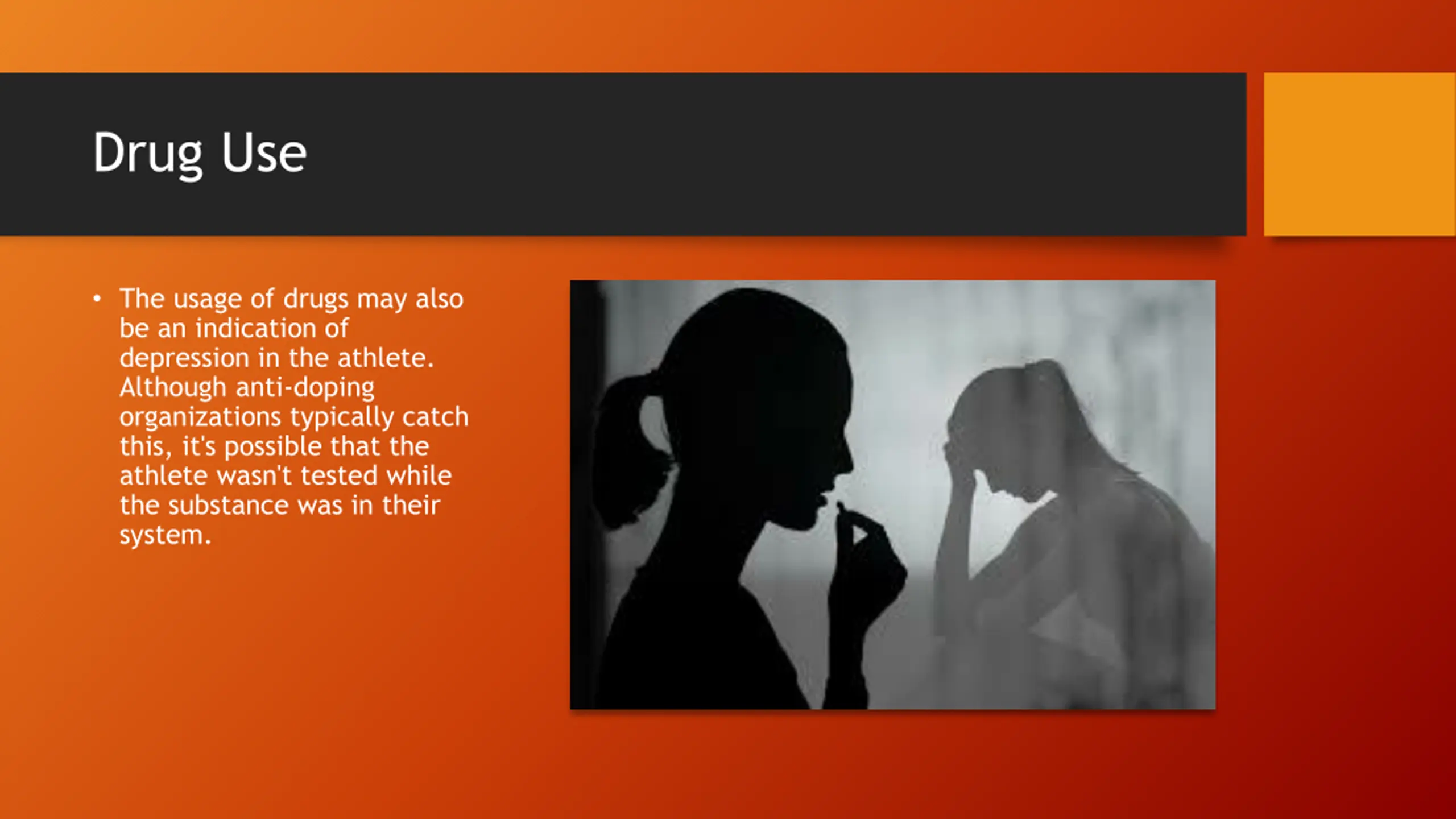 Drug Use The usage of drugs may also be an indication of depression in the athlete. Although anti-doping organizations typically catch this, it's possible that the athlete wasn't tested while the substance was in their system.