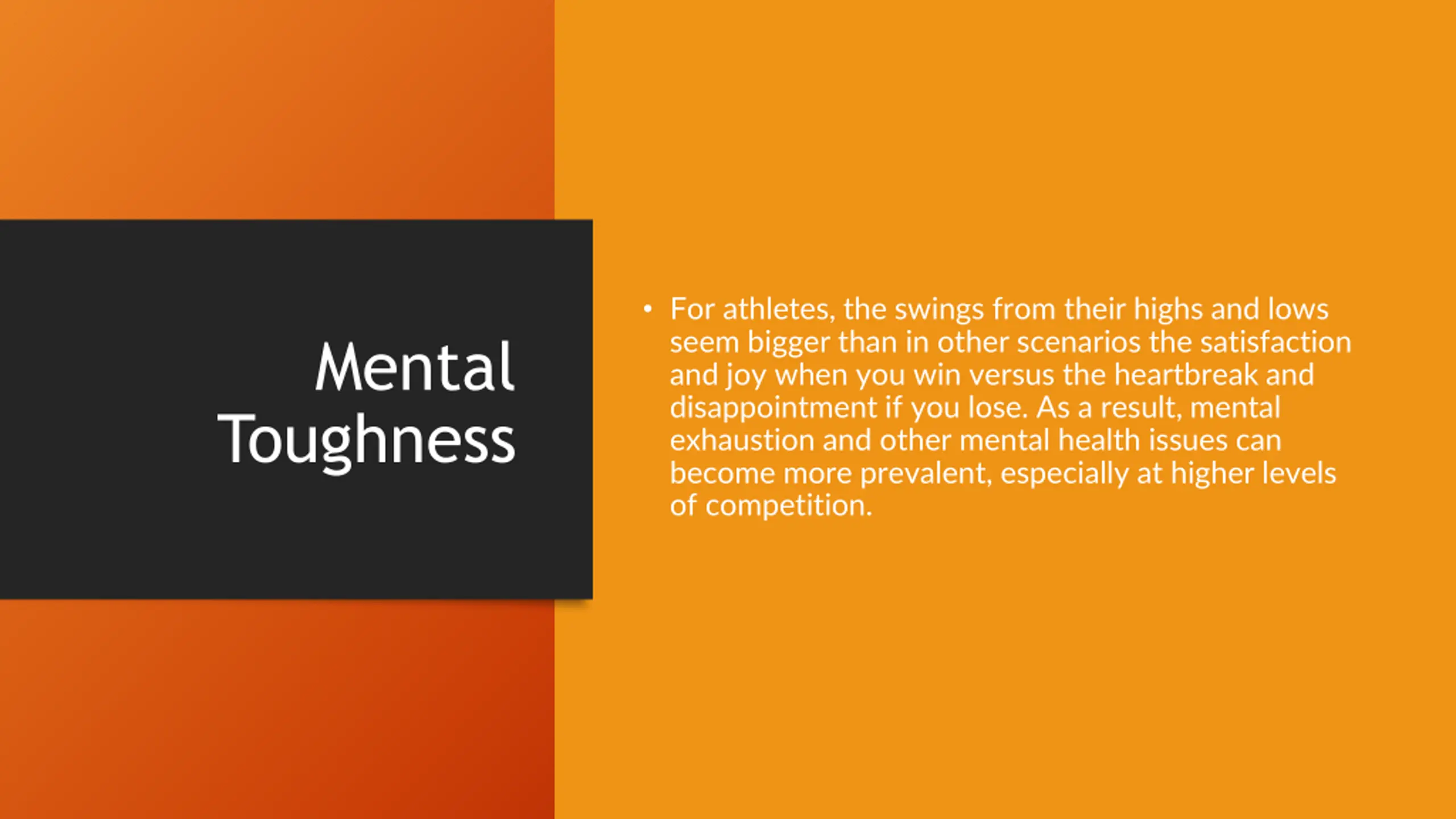 For athletes, the swings from their highs and lows seem bigger than in other scenarios the satisfaction and joy when you win versus the heartbreak and disappointment if you lose. As a result, mental exhaustion and other mental health issues can become more prevalent, especially at higher levels of competition. Mental Toughness