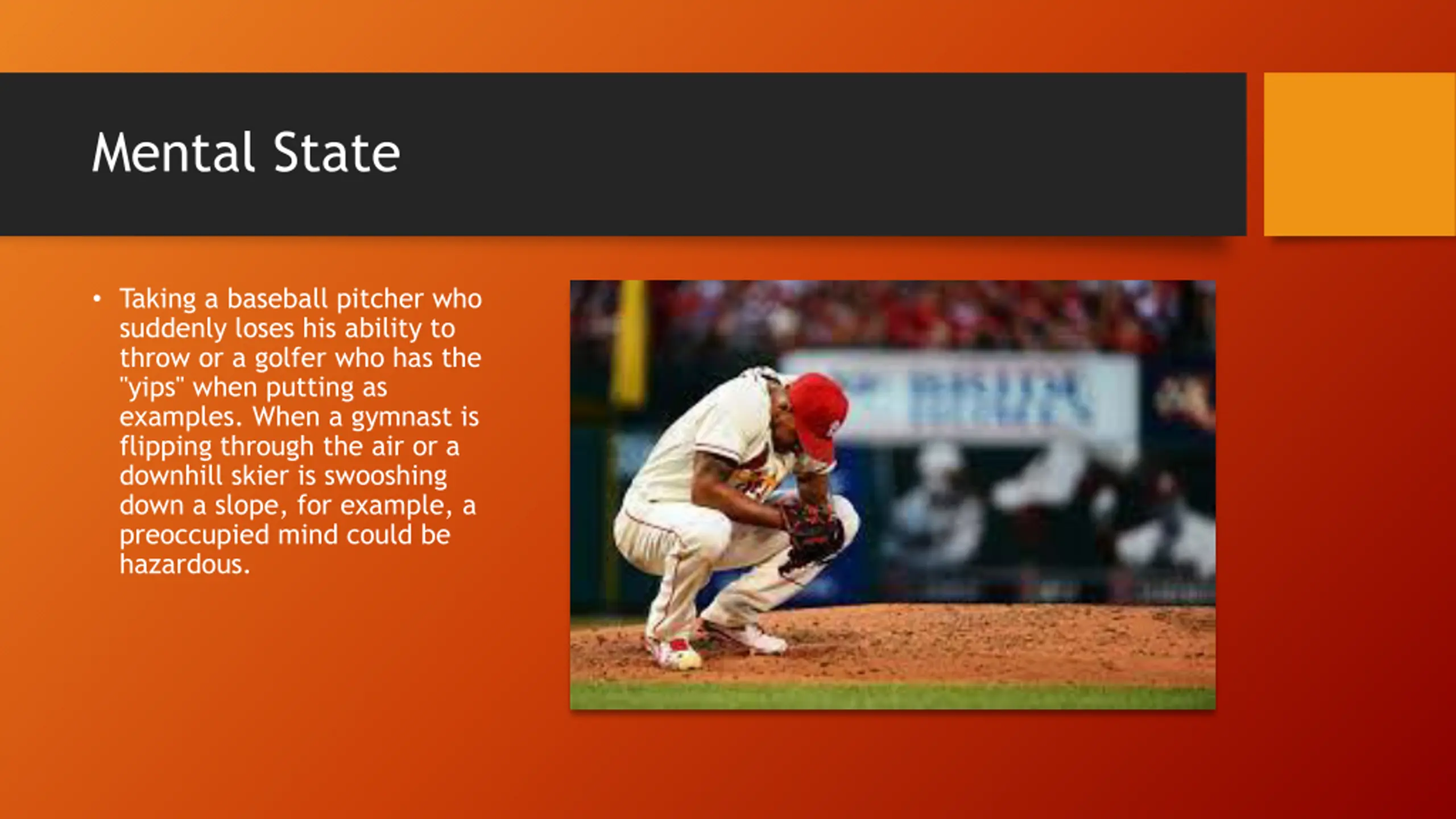 Mental State Taking a baseball pitcher who suddenly loses his ability to throw or a golfer who has the "yips" when putting as examples. When a gymnast is flipping through the air or a downhill skier is swooshing down a slope, for example, a preoccupied mind could be hazardous.