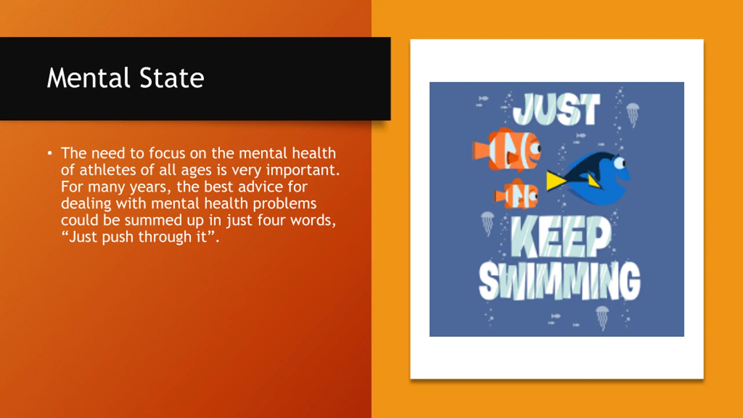 Mental State The need to focus on the mental health of athletes of all ages is very important. For many years, the best advice for dealing with mental health problems could be summed up in just four words, Just push through it .