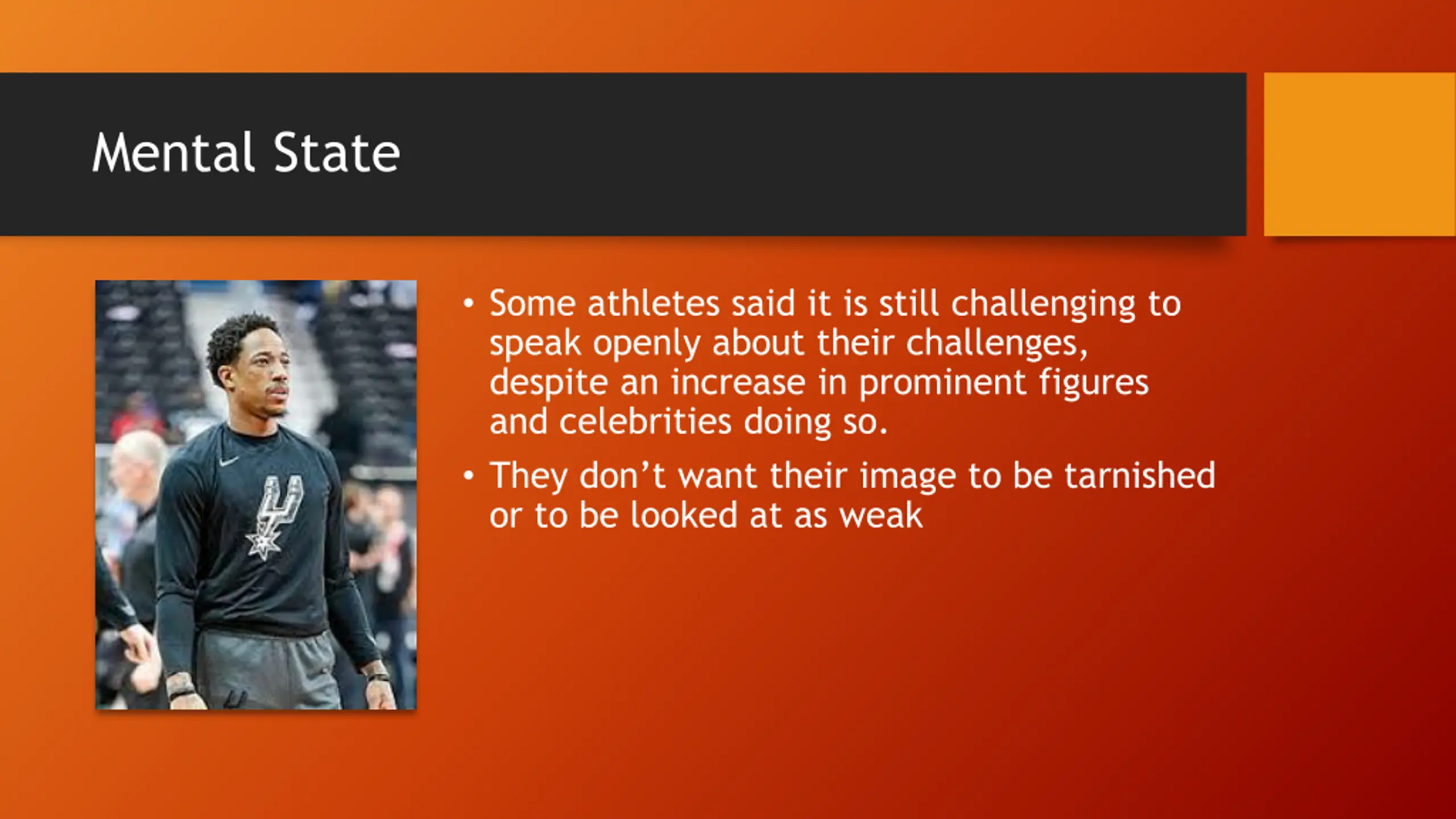Mental State Some athletes said it is still challenging to speak openly about their challenges, despite an increase in prominent figures and celebrities doing so. They don t want their image to be tarnished or to be looked at as weak