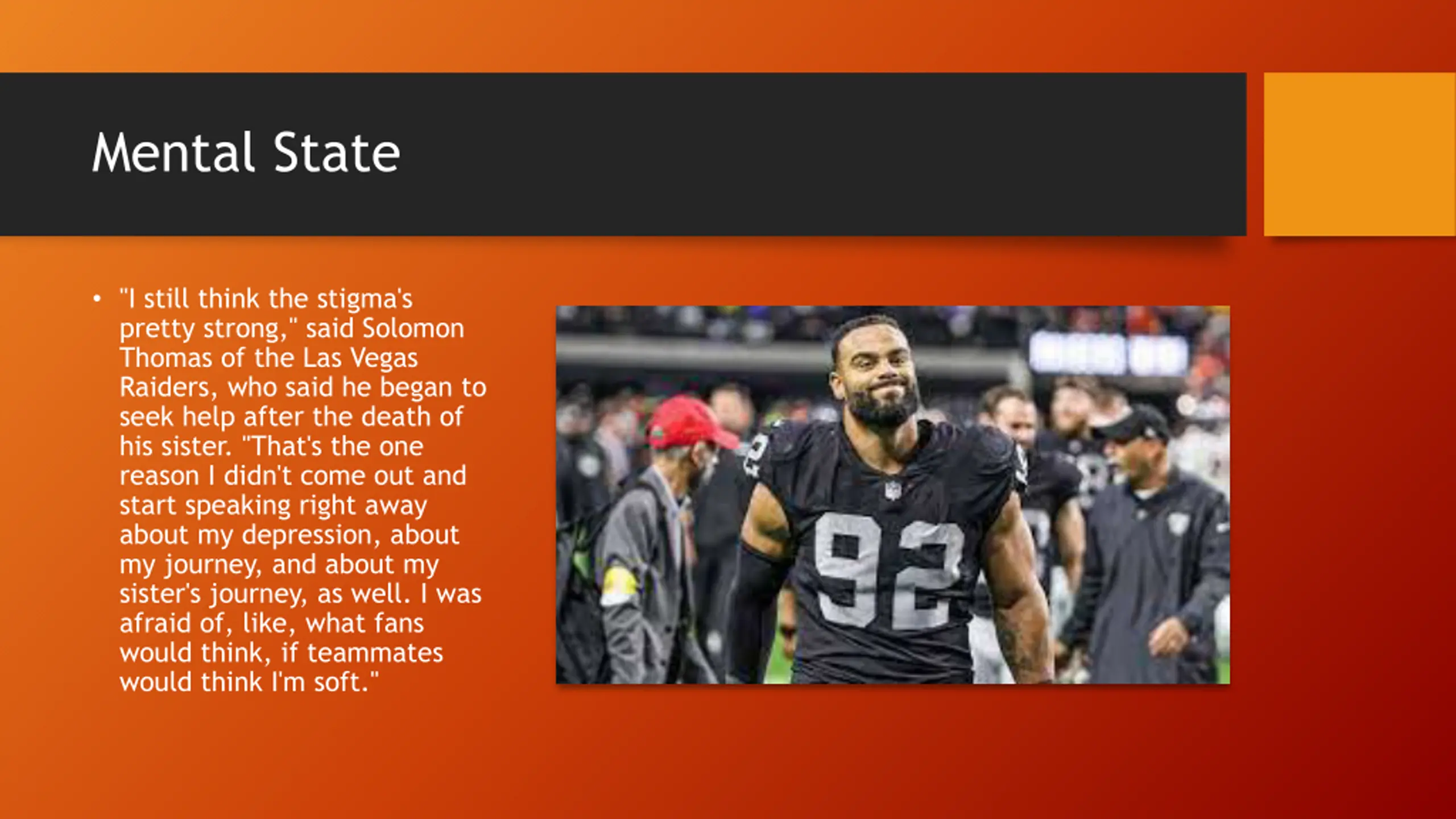Mental State "I still think the stigma's pretty strong," said Solomon Thomas of the Las Vegas Raiders, who said he began to seek help after the death of his sister. "That's the one reason I didn't come out and start speaking right away about my depression, about my journey, and about my sister's journey, as well. I was afraid of, like, what fans would think, if teammates would think I'm soft."