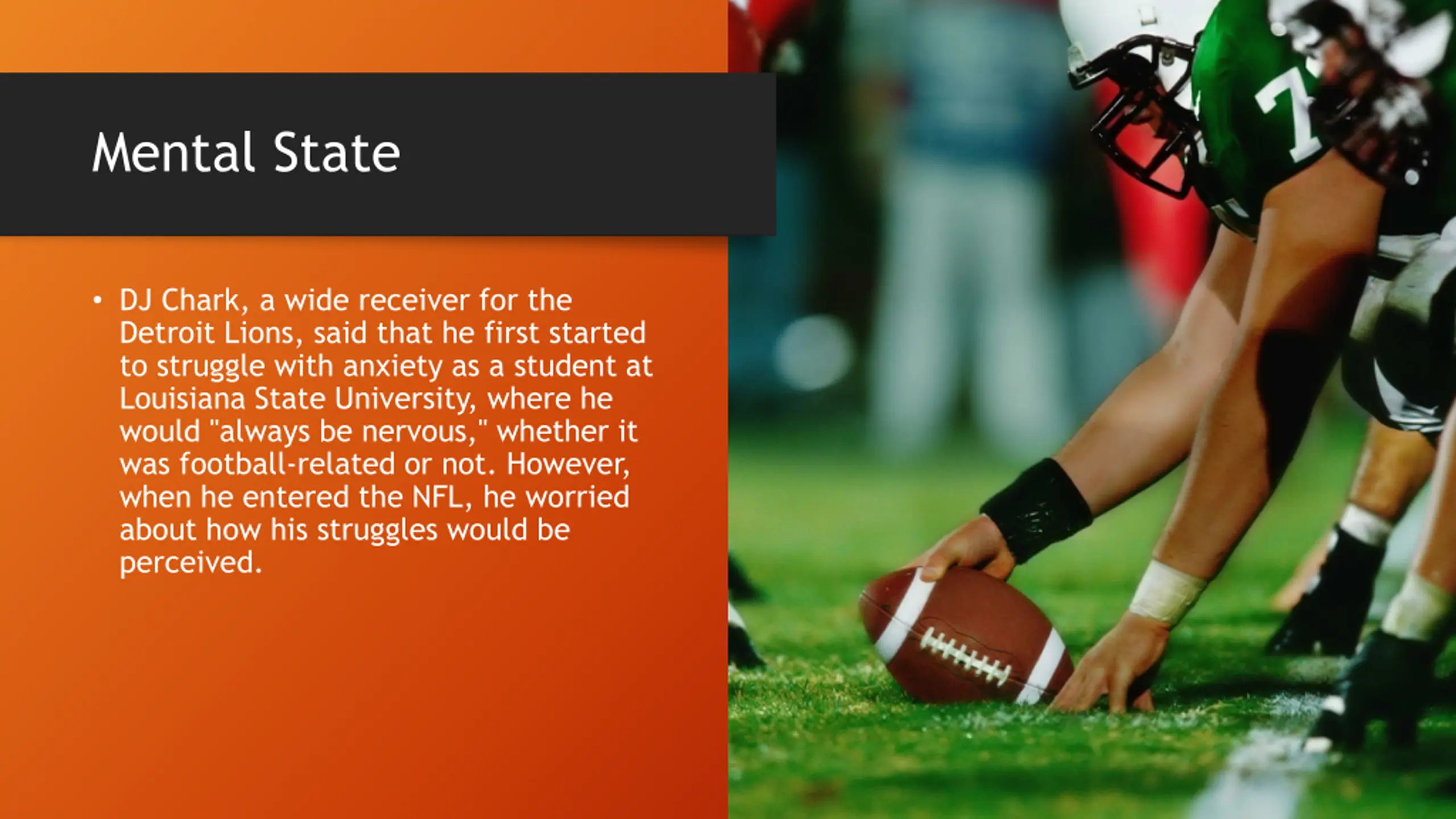 Mental State DJ Chark, a wide receiver for the Detroit Lions, said that he first started to struggle with anxiety as a student at Louisiana State University, where he would "always be nervous," whether it was football-related or not. However, when he entered the NFL, he worried about how his struggles would be perceived.