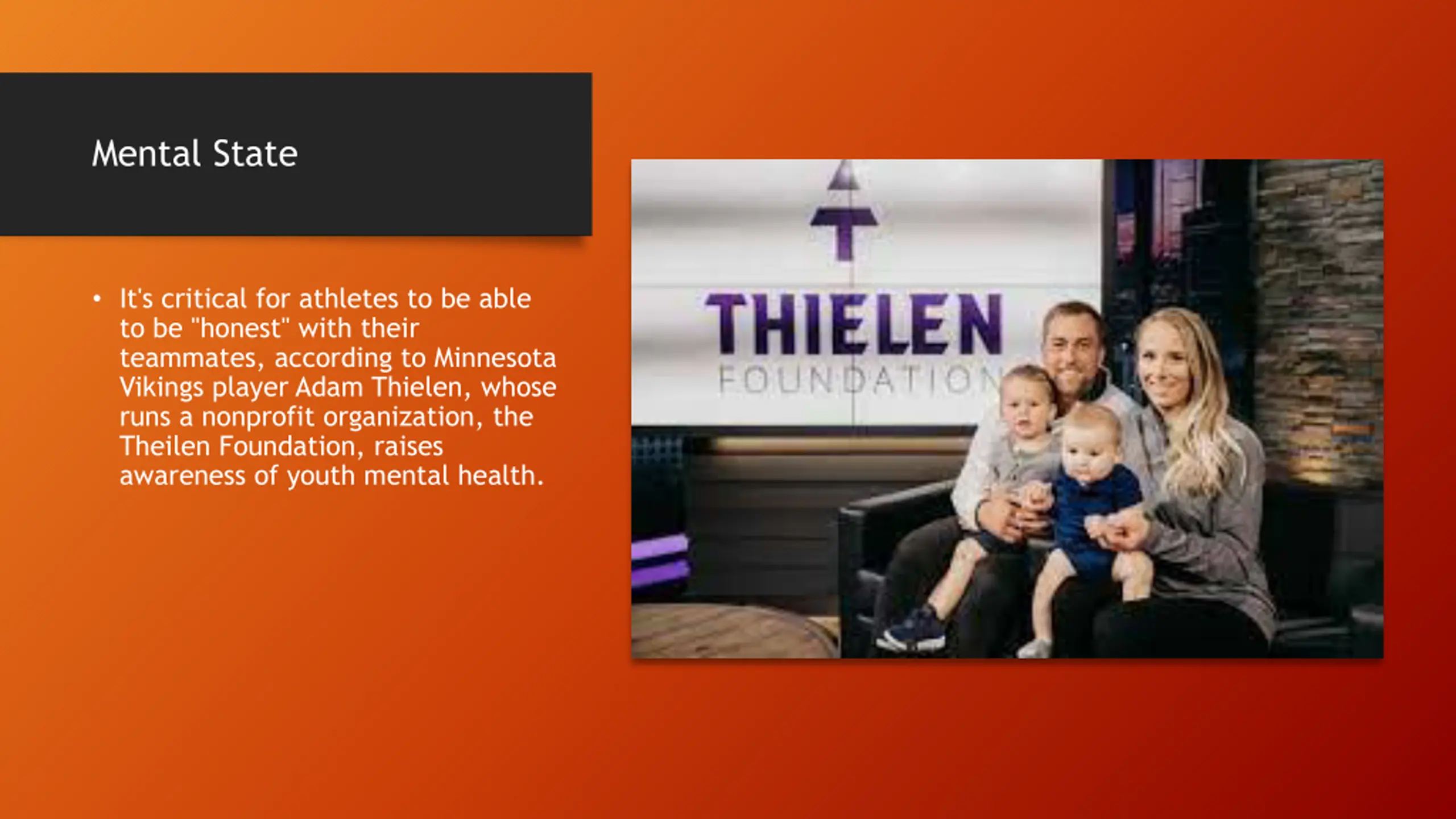 Mental State It's critical for athletes to be able to be "honest" with their teammates, according to Minnesota Vikings player Adam Thielen, whose runs a nonprofit organization, the Theilen Foundation, raises awareness of youth mental health.