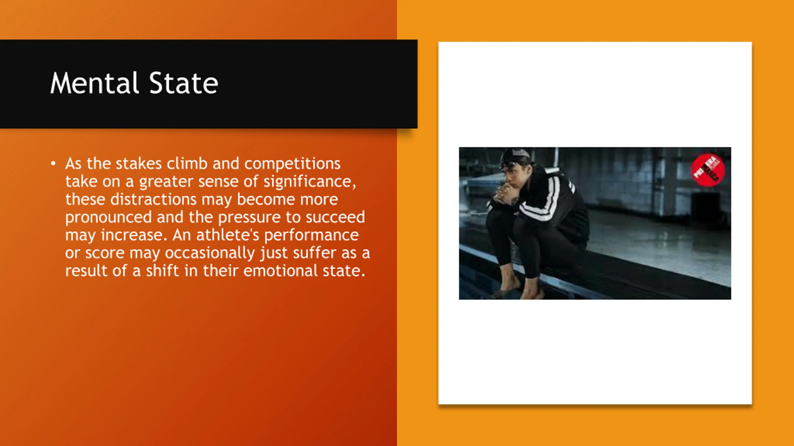 Mental State As the stakes climb and competitions take on a greater sense of significance, these distractions may become more pronounced and the pressure to succeed may increase. An athlete's performance or score may occasionally just suffer as a result of a shift in their emotional state.