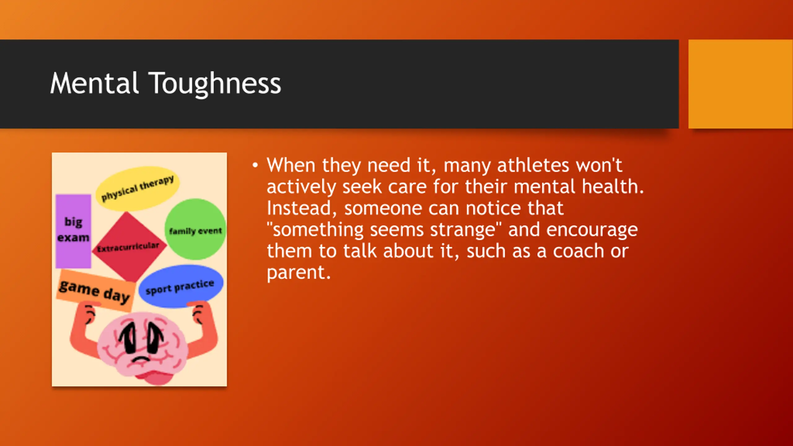Mental Toughness When they need it, many athletes won't actively seek care for their mental health. Instead, someone can notice that "something seems strange" and encourage them to talk about it, such as a coach or parent.