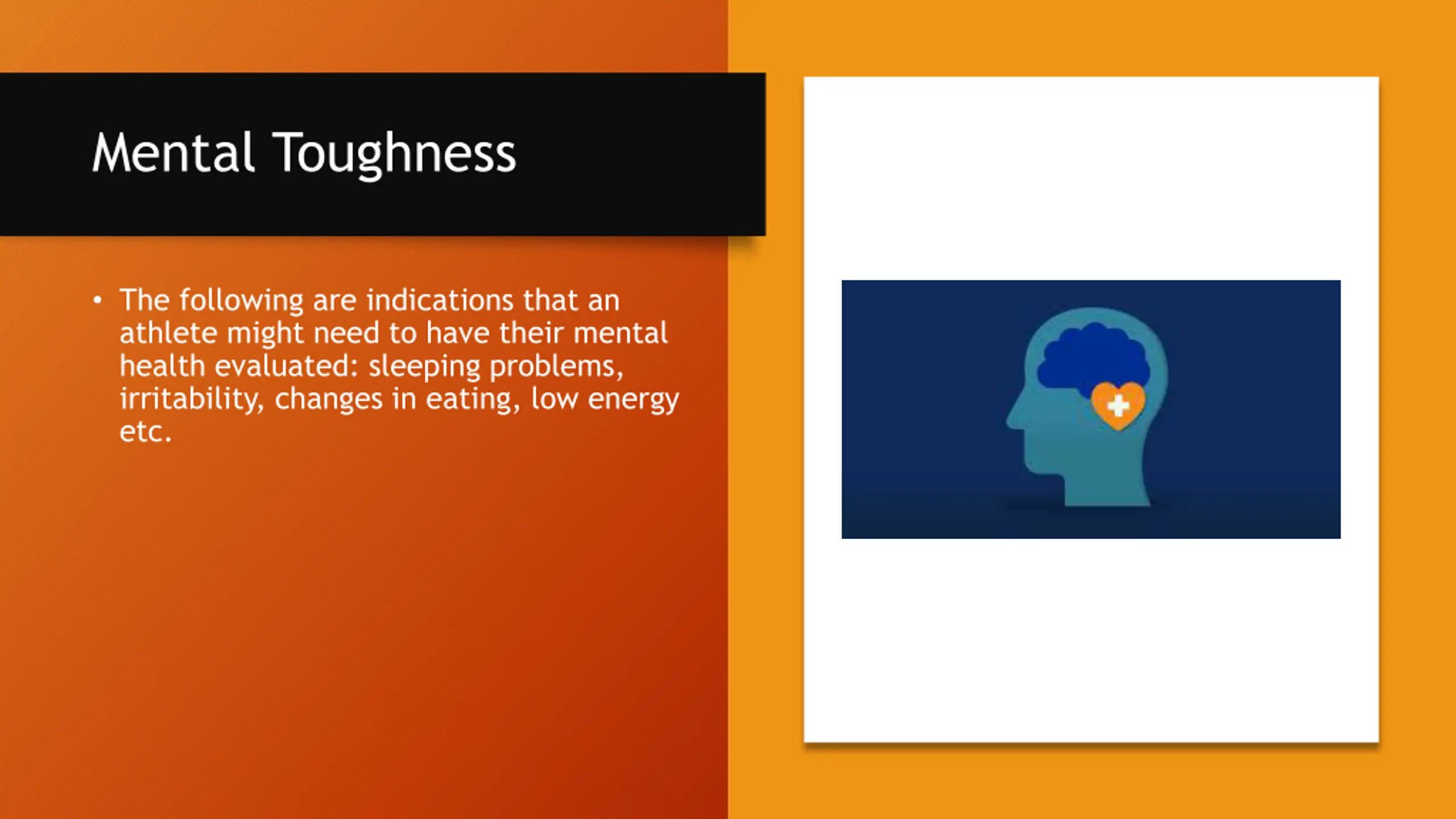 Mental Toughness The following are indications that an athlete might need to have their mental health evaluated: sleeping problems, irritability, changes in eating, low energy etc.