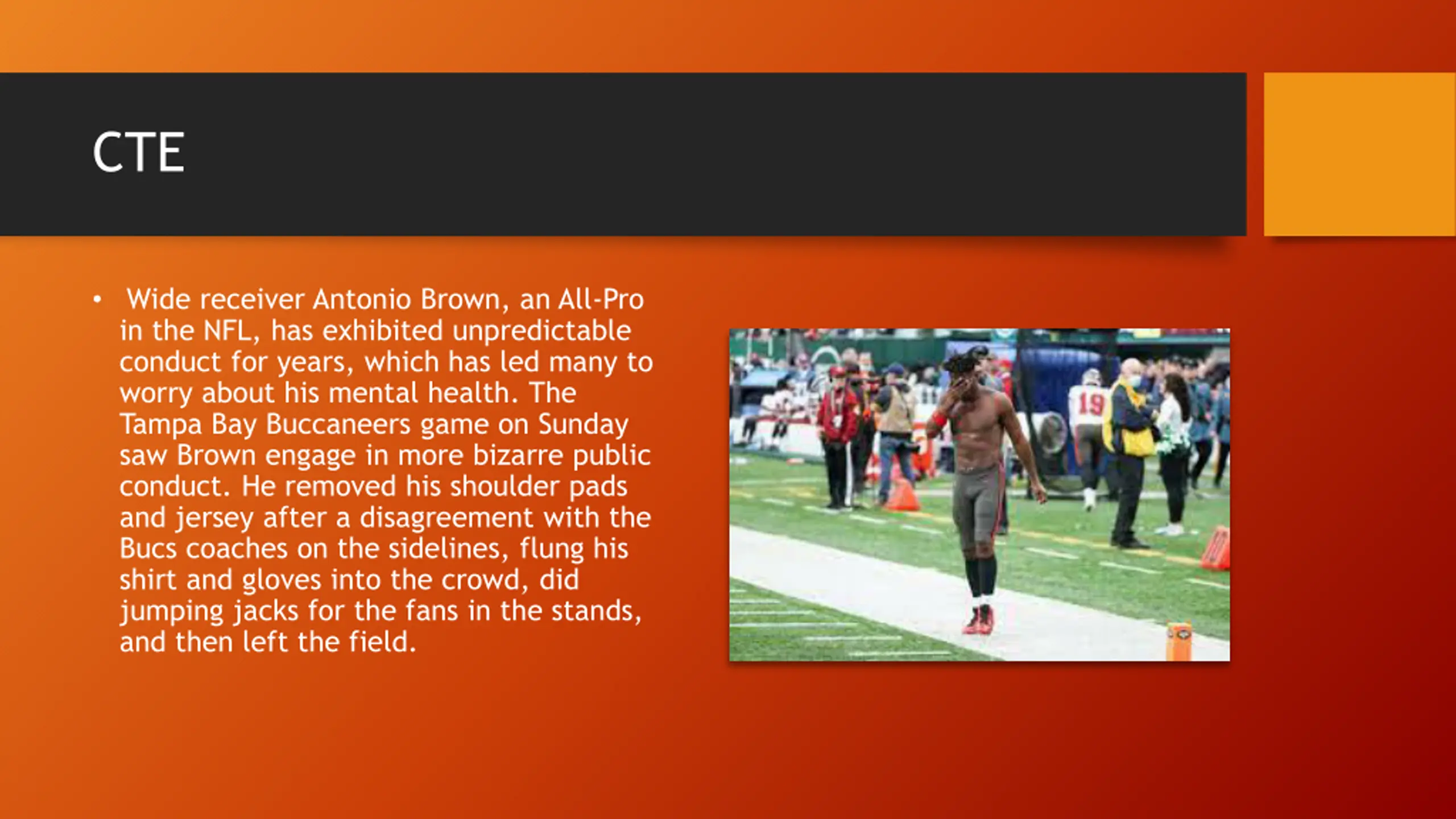 CTE Wide receiver Antonio Brown, an All-Pro in the NFL, has exhibited unpredictable conduct for years, which has led many to worry about his mental health. The Tampa Bay Buccaneers game on Sunday saw Brown engage in more bizarre public conduct. He removed his shoulder pads and jersey after a disagreement with the Bucs coaches on the sidelines, flung his shirt and gloves into the crowd, did jumping jacks for the fans in the stands, and then left the field.
