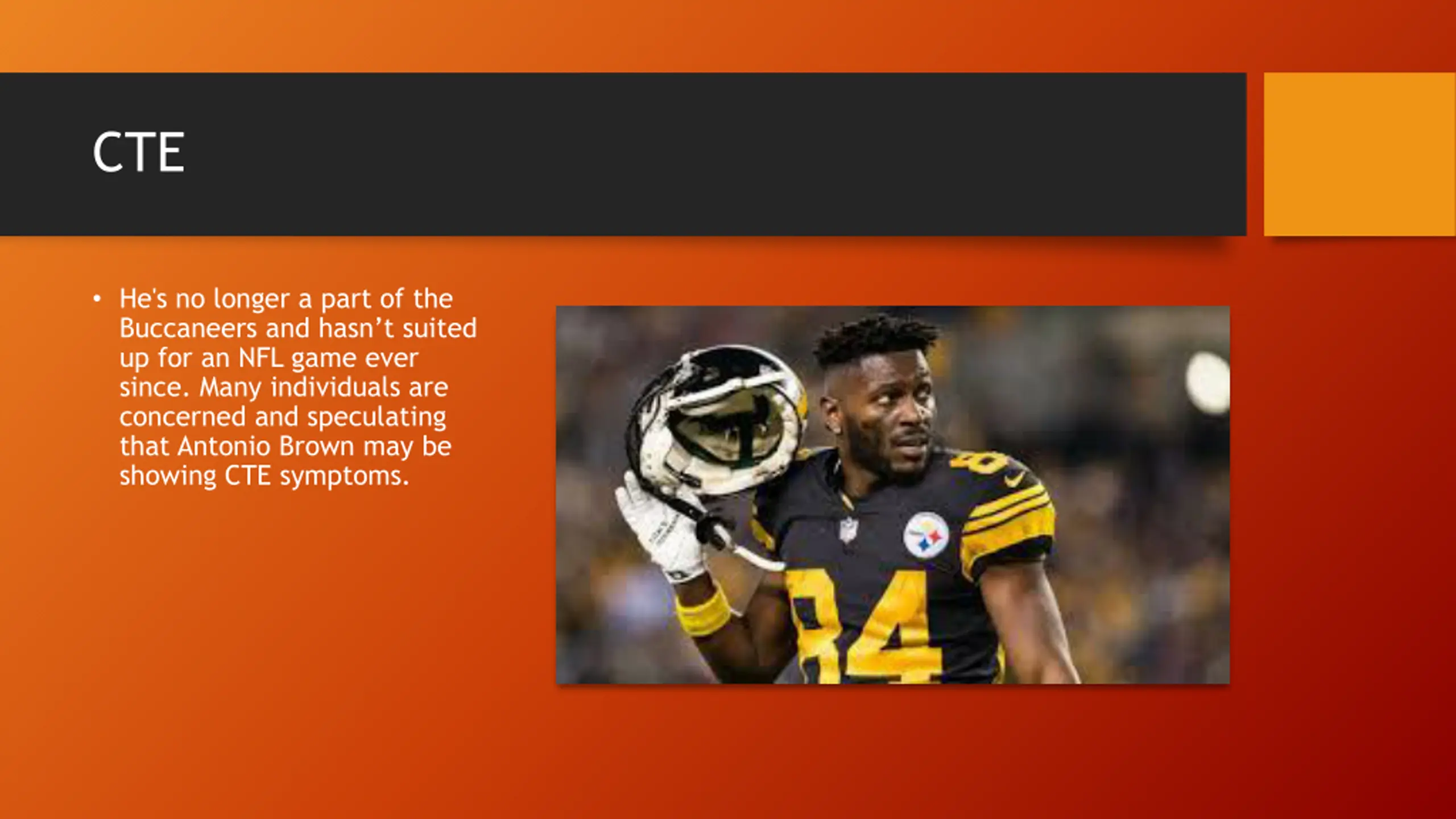 CTE He's no longer a part of the Buccaneers and hasn t suited up for an NFL game ever since. Many individuals are concerned and speculating that Antonio Brown may be showing CTE symptoms.