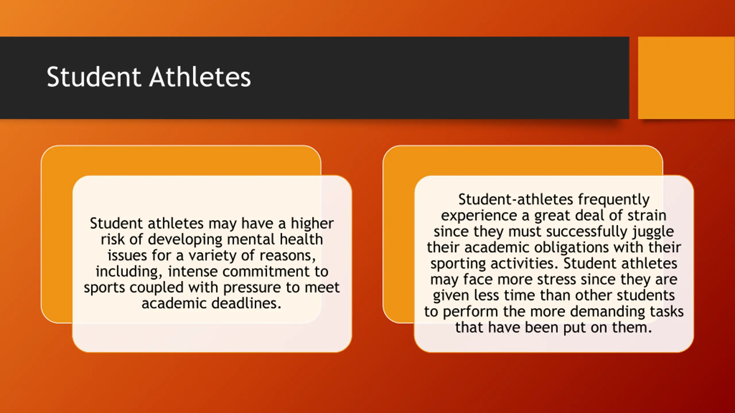 Student Athletes Student-athletes frequently experience a great deal of strain since they must successfully juggle their academic obligations with their sporting activities. Student athletes may face more stress since they are given less time than other students to perform the more demanding tasks that have been put on them. Student athletes may have a higher risk of developing mental health issues for a variety of reasons, including, intense commitment to sports coupled with pressure to meet academic deadlines.