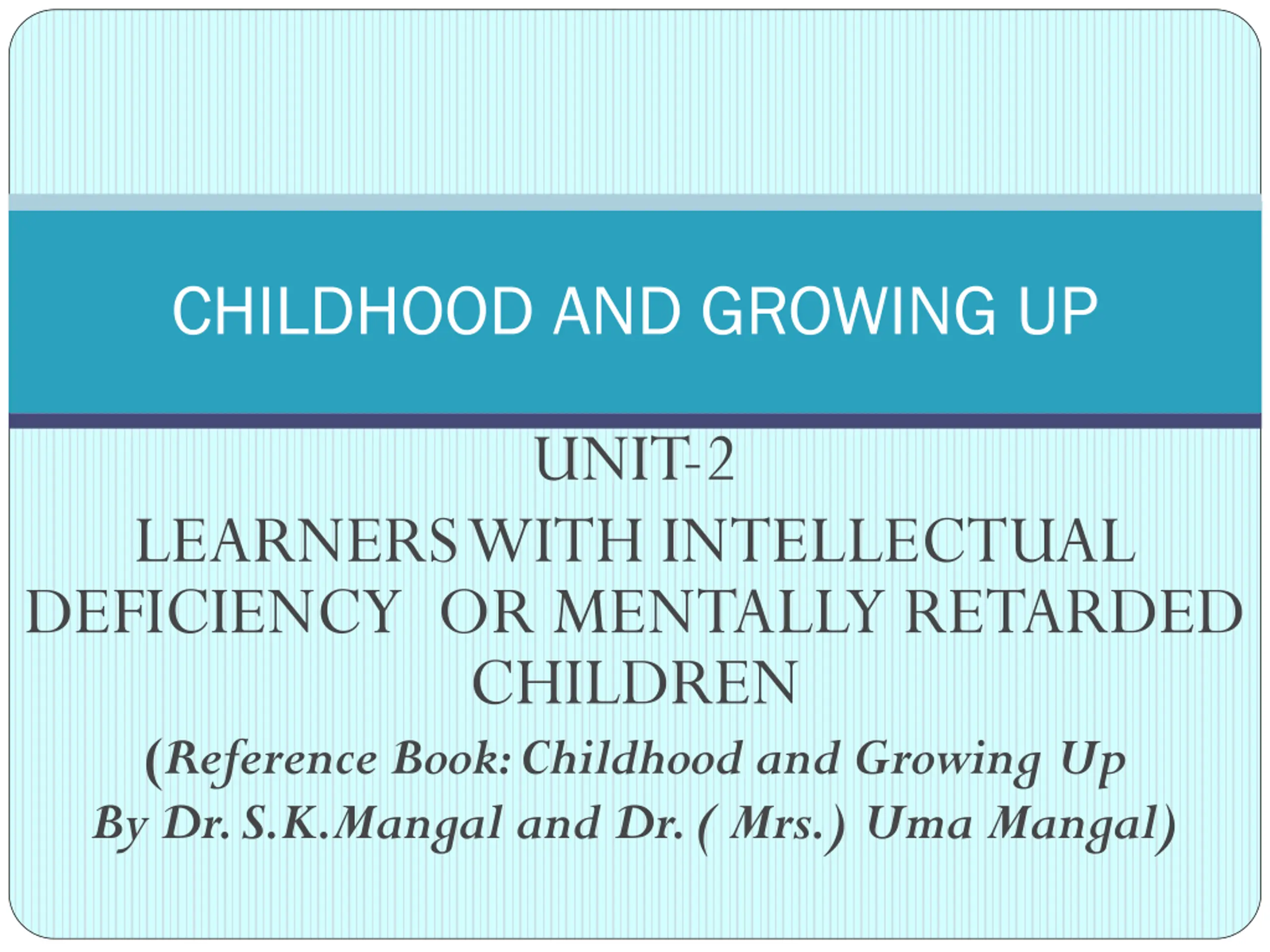 CHILDHOOD AND GROWING UP UNIT-2 LEARNERS WITH INTELLECTUAL DEFICIENCY OR MENTALLY RETARDED CHILDREN (Reference Book: Childhood and Growing Up By Dr. S.K.Mangal and Dr. ( Mrs.) Uma Mangal)