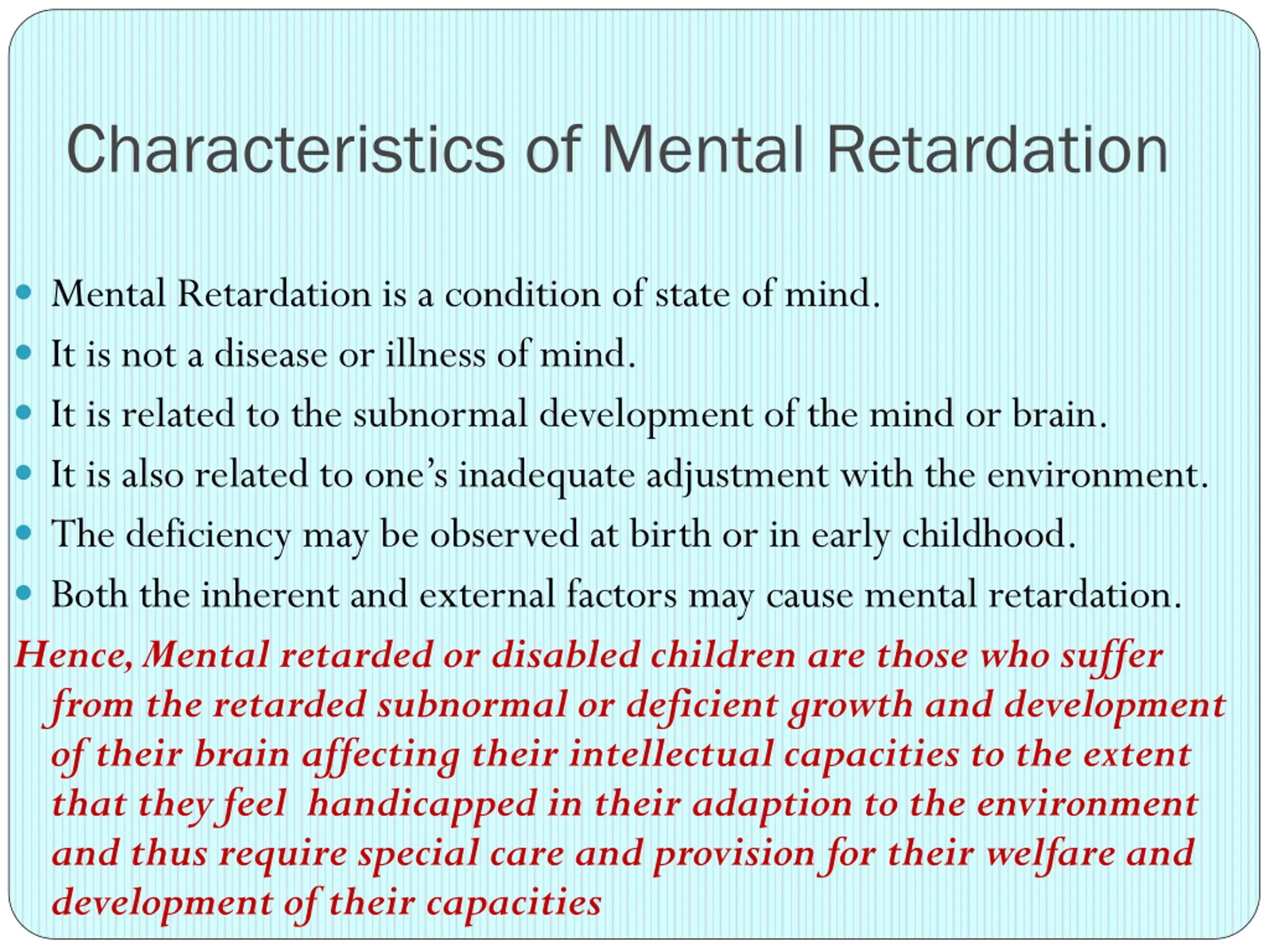 Characteristics of Mental Retardation Mental Retardation is a condition of state of mind. It is not a disease or illness of mind. It is related to the subnormal development of the mind or brain. It is also related to one s inadequate adjustment with the environment. The deficiency may be observed at birth or in early childhood. Both the inherent and external factors may cause mental retardation. Hence, Mental retarded or disabled children are those who suffer from the retarded subnormal or deficient growth and development of their brain affecting their intellectual capacities to the extent that they feel handicapped in their adaption to the environment and thus require special care and provision for their welfare and development of their capacities