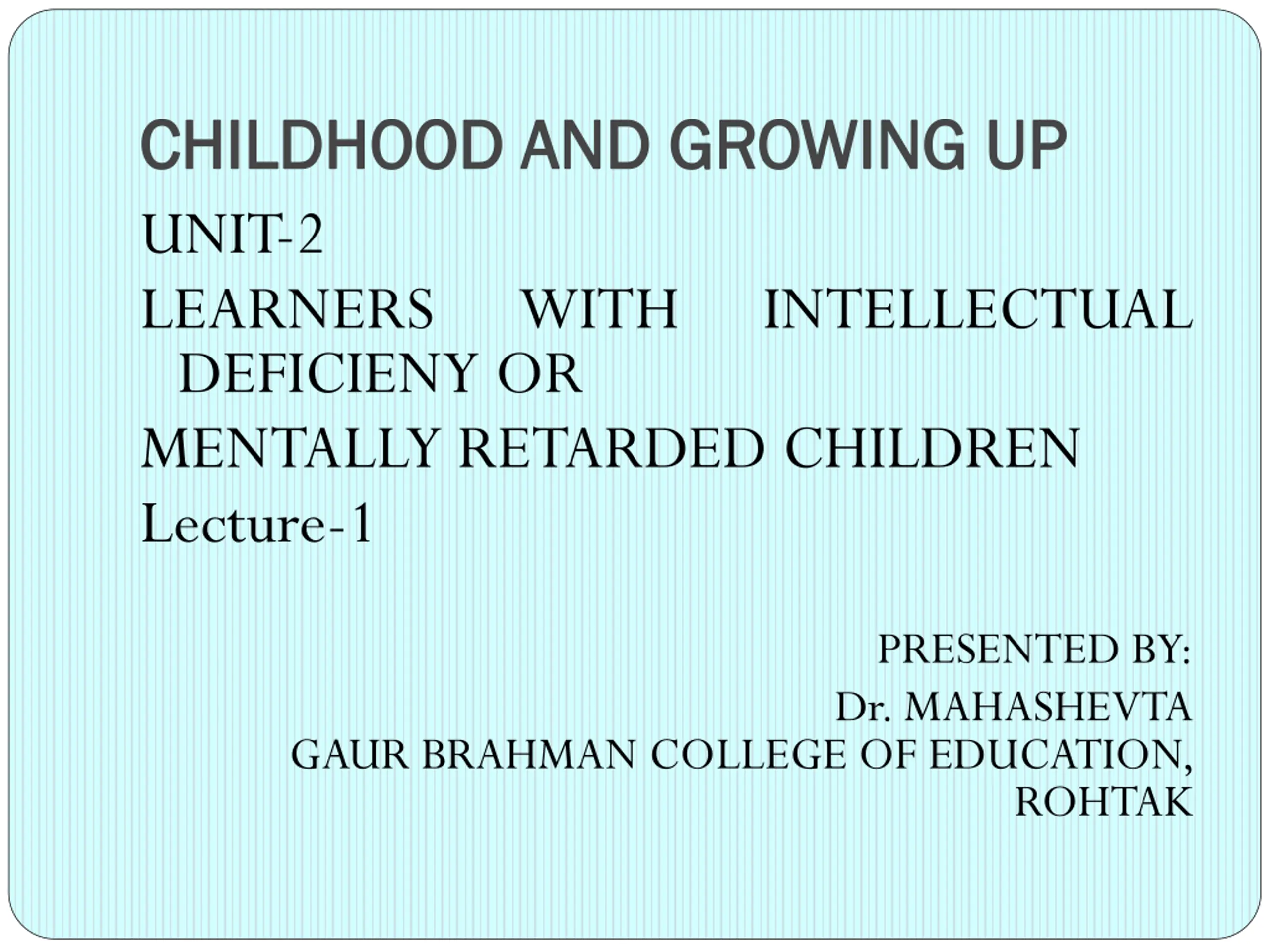 CHILDHOOD AND GROWING UP CHILDHOOD AND GROWING UP UNIT-2 LEARNERS WITH DEFICIENY OR MENTALLY RETARDED CHILDREN Lecture-1 INTELLECTUAL PRESENTED BY: Dr. MAHASHEVTA GAUR BRAHMAN COLLEGE OF EDUCATION, ROHTAK
