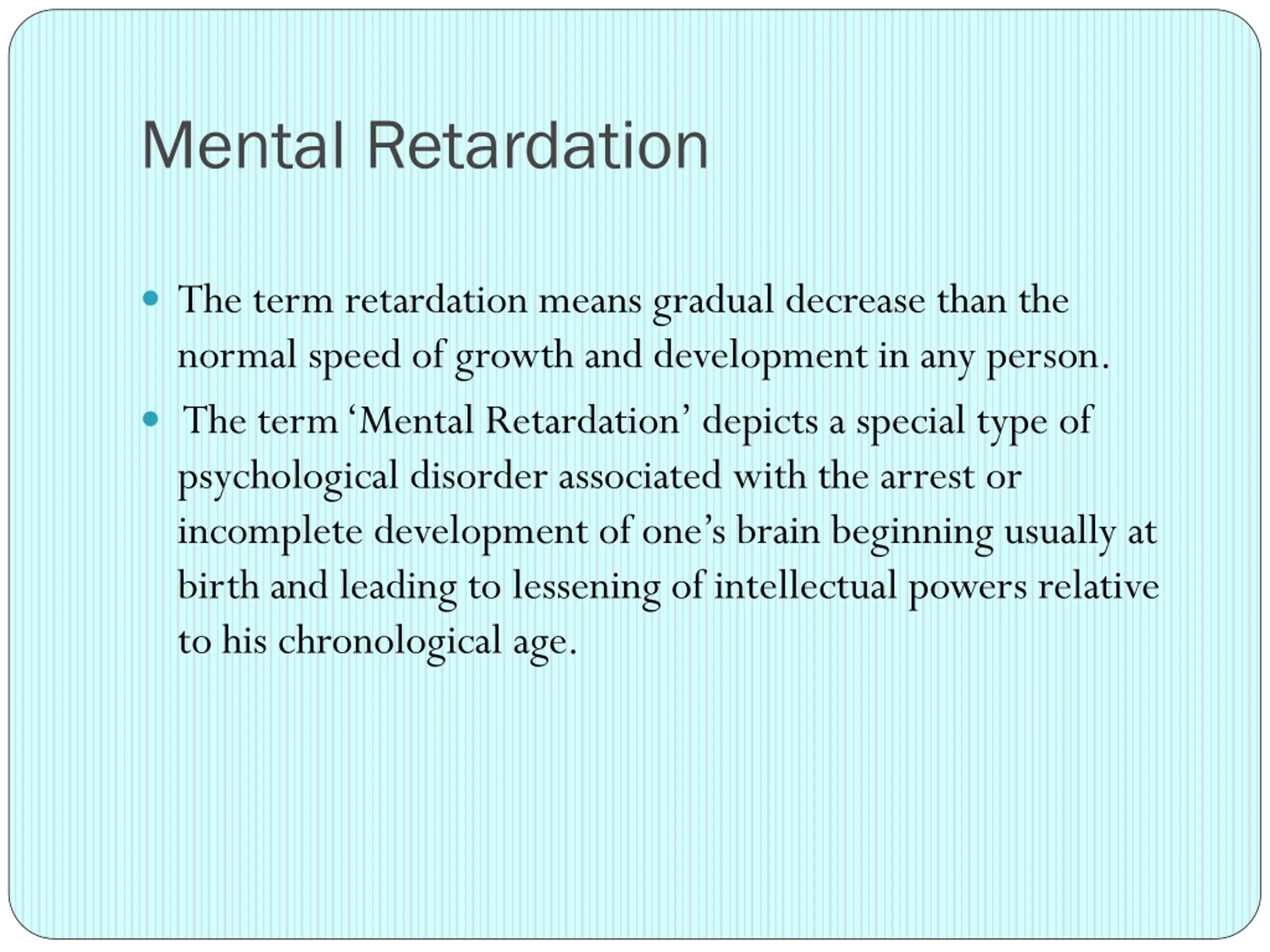 Mental Retardation The term retardation means gradual decrease than the normal speed of growth and development in any person. The term Mental Retardation depicts a special type of psychological disorder associated with the arrest or incomplete development of one s brain beginning usually at birth and leading to lessening of intellectual powers relative to his chronological age.